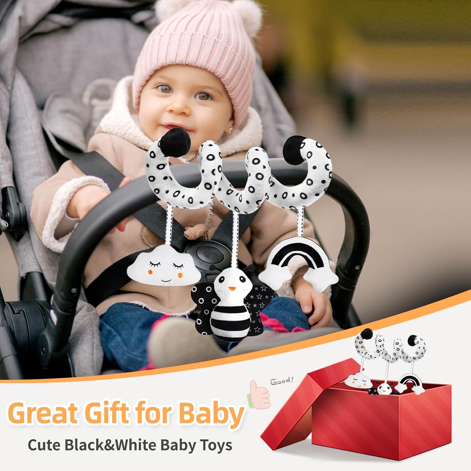 UCDOET Child Automobile Seat Toys for Infants 0-6 Months, Black and White Excessive Distinction Sensory Toy for New child 0-3 Months, Hanging Stroller Infants Toys for Mattress Bassinet Crib Child Provider Presents