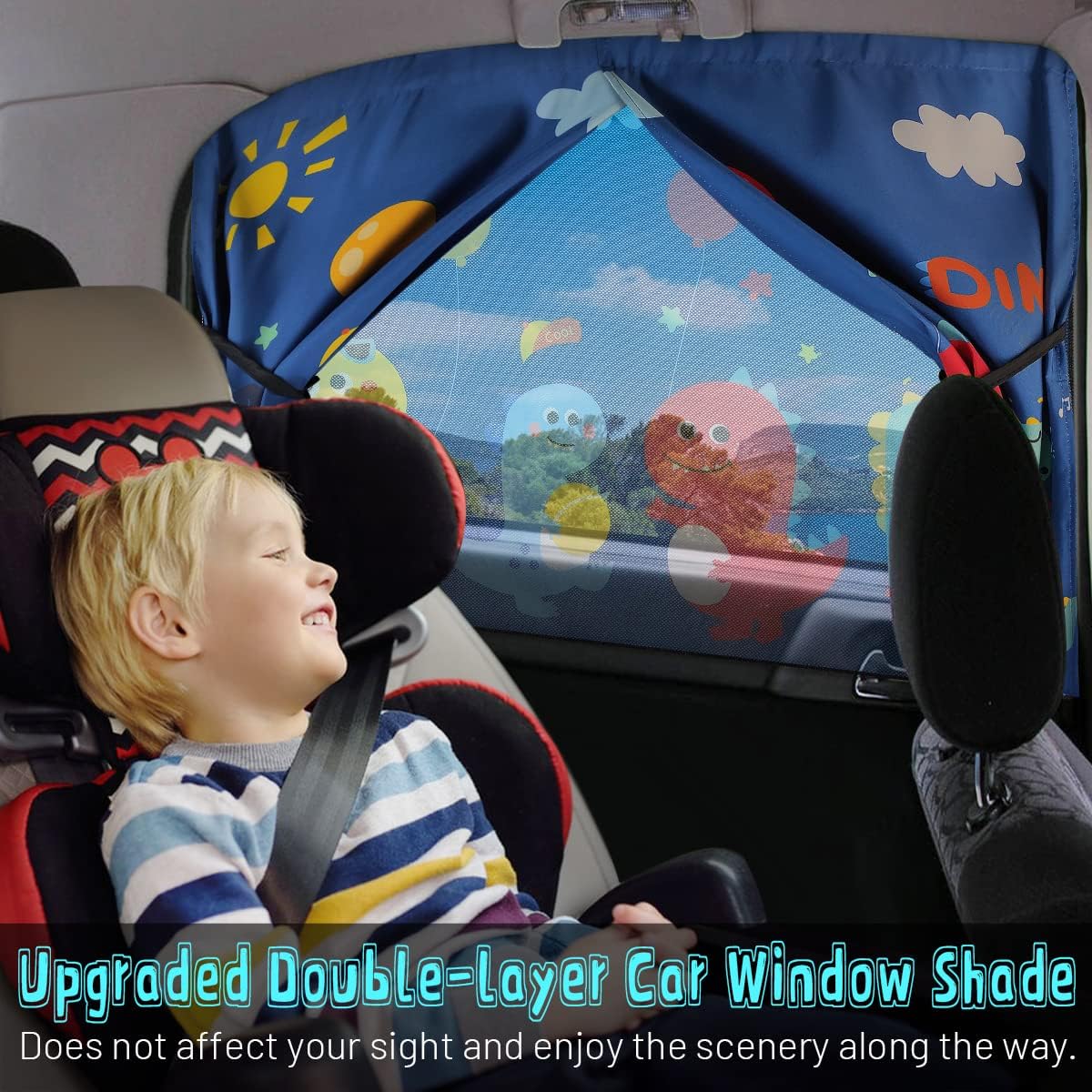 Double-layer cloth. Full shade and half shade choices. 7 sturdy magnets. Cute dinosaurs sample. Block 99% solar glare & UV rays.