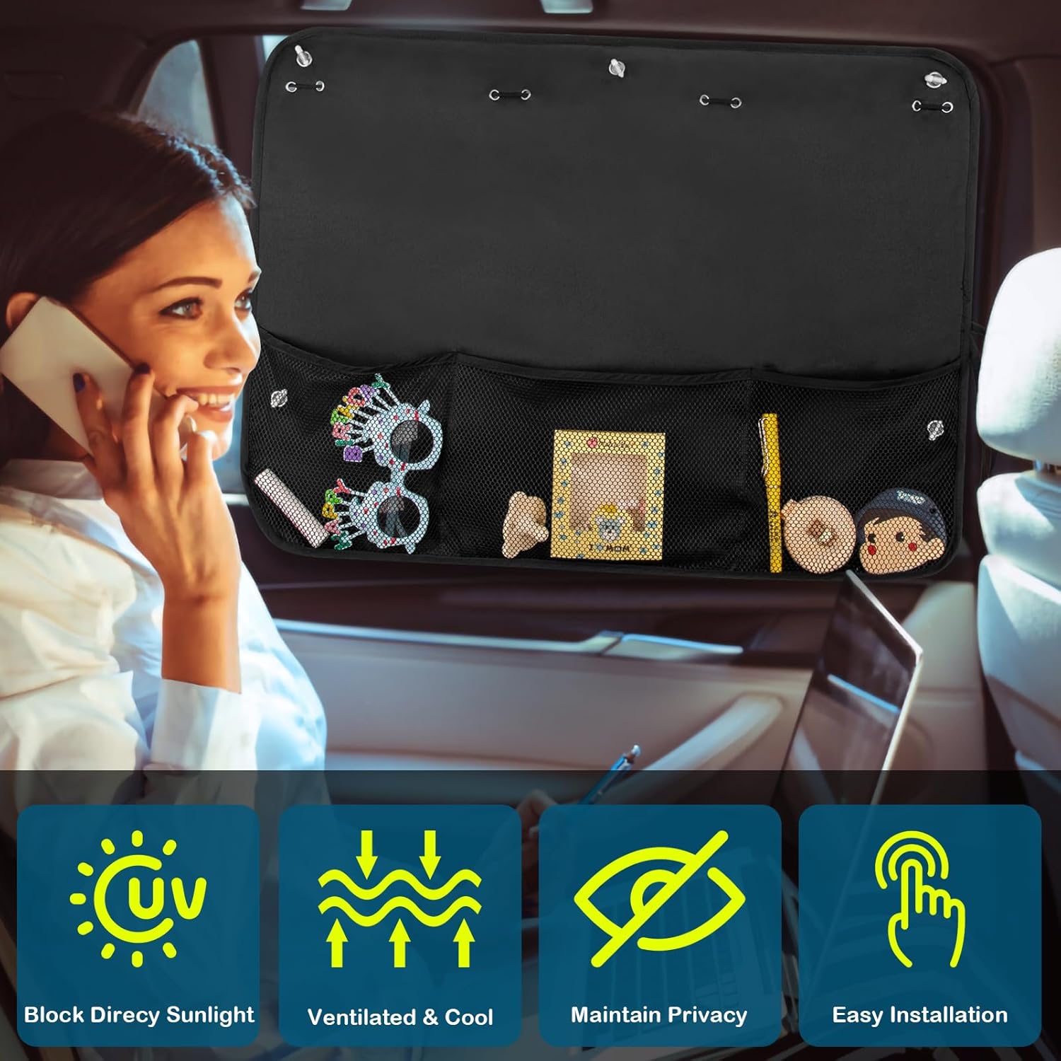 Car Window Shades,2 Pcs Full Cover for Baby with Storage Net Pocket, 7 Suction Cups, Blackout Back Side Window Curtains, Car Camping Accessories