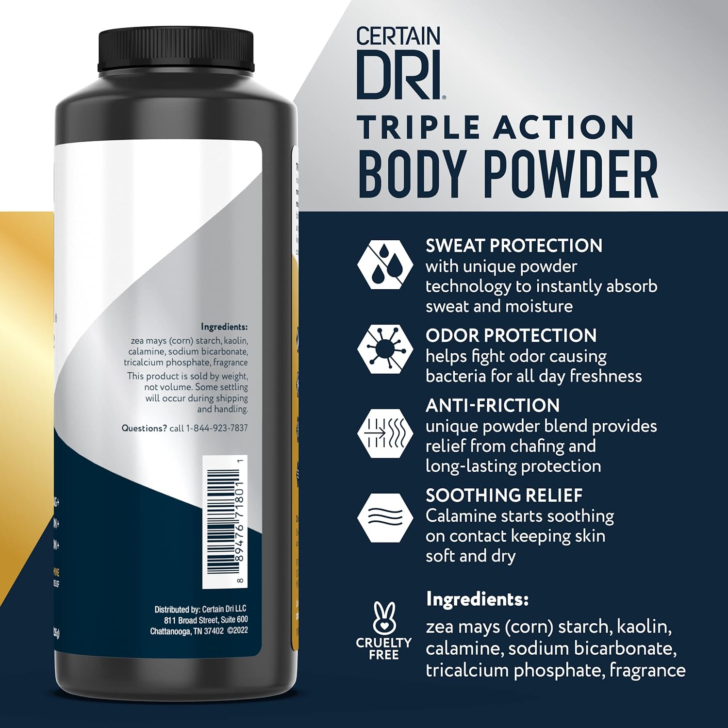 On the spot Sweat Absorption: Sure Dri Triple Motion Physique Powder immediately absorbs sweat and moisture whereas combating odor-causing micro organism for all-day freshness.