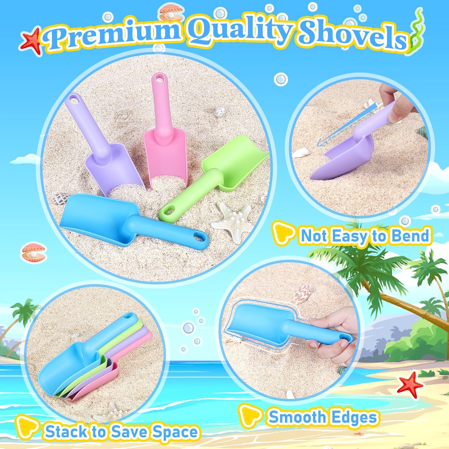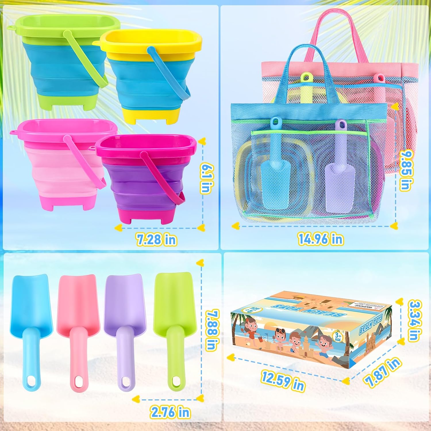 Consists of foldable seashore bucket * 4, sand shovel * 4, seashore tote bag * 2Compact design for travelMade with secure materials, BPA free, non-toxic and straightforward to cleanPerfect for toddlers, children, adults