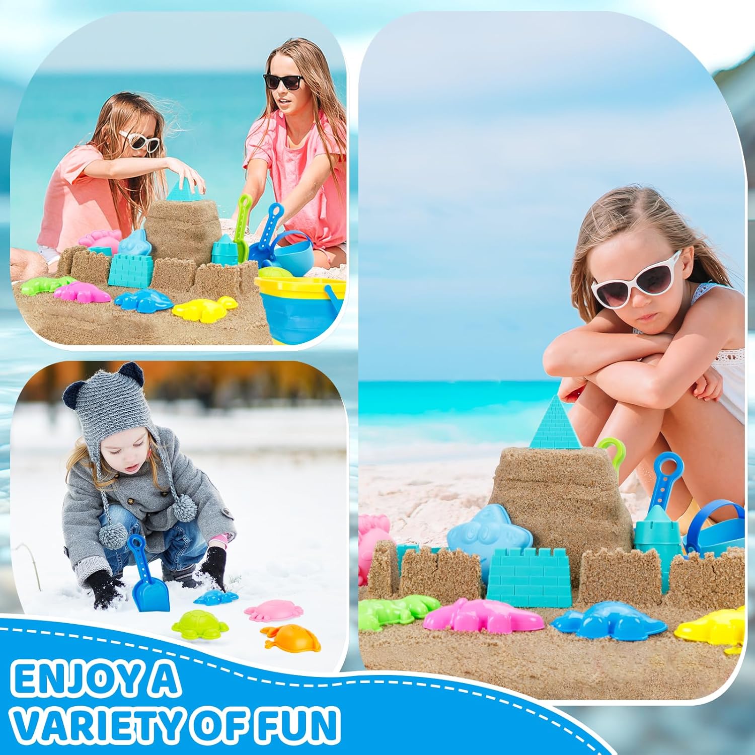 Numerous Sand Molds: This seashore toys set contains inventive sand molds to make sand castles, sea animals. All of the sand molds and instruments are made in birght colours and cute shapes, encouraging youngsters to make use of their creativity to make their very own sea world on the seashore!