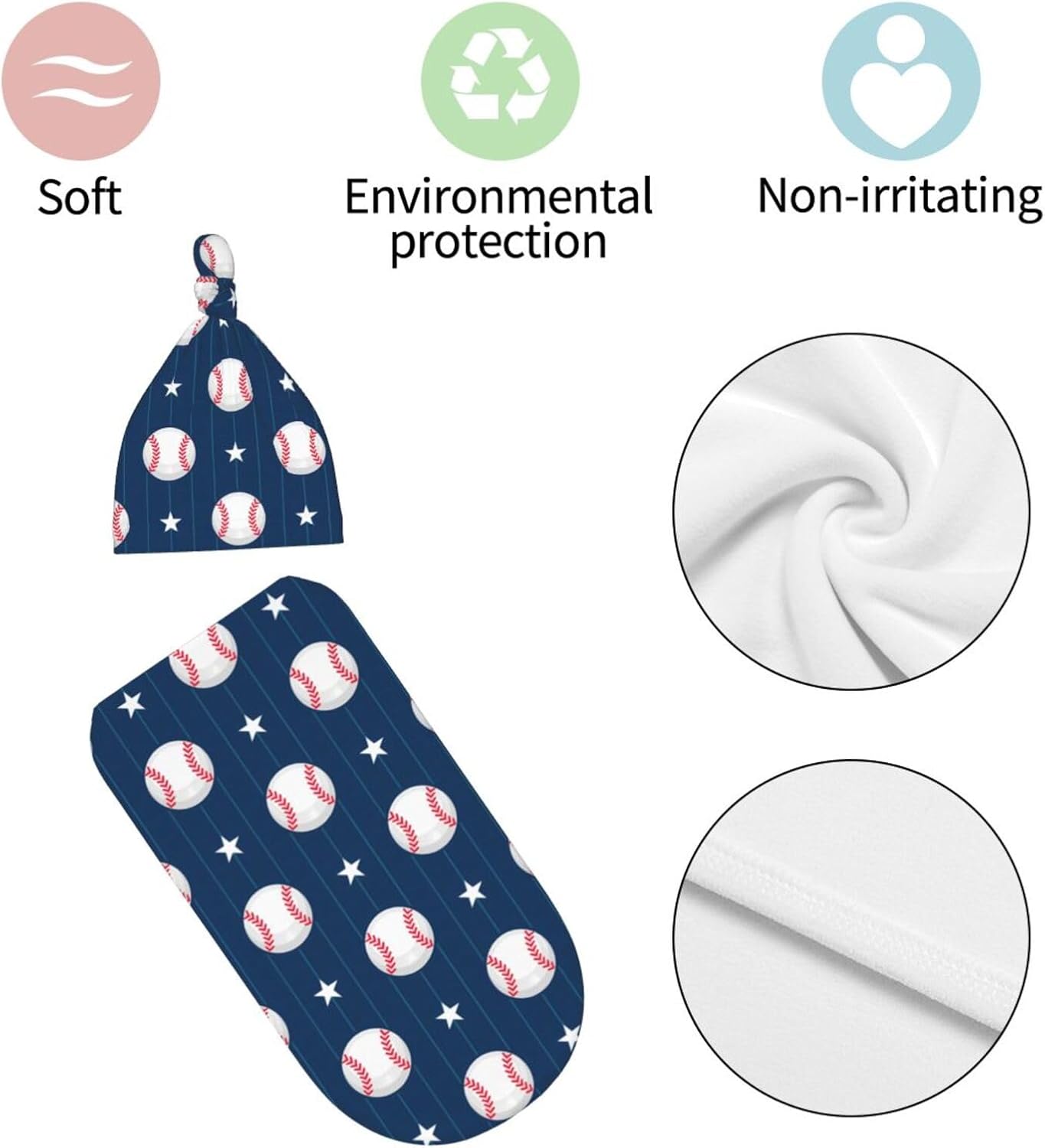 Cute Baseball Print Baby Stuff Swaddle Blanket Hat Set for Boys Girls, Soft Newborn Sleeping Sack Receiving Blanket Shower Gift