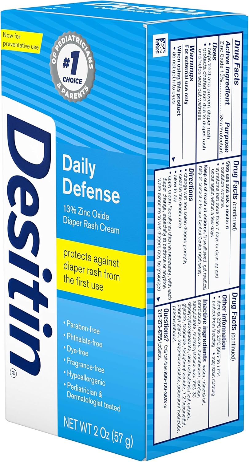 2-ounces of Desitin Every day Protection Child Diaper Rash Cream, in a tsa-compliant travel-sized tube, that works from the primary use to assist soothe, deal with and stop diaper rash