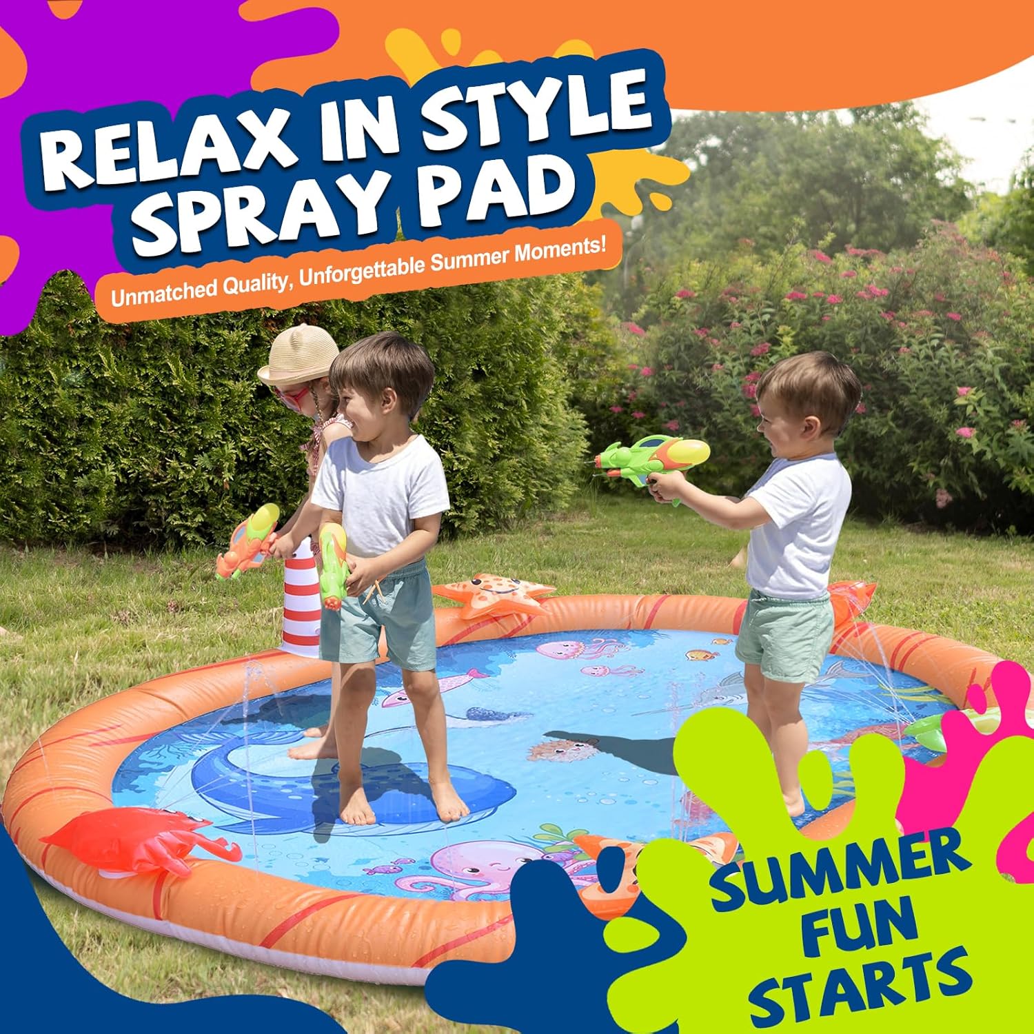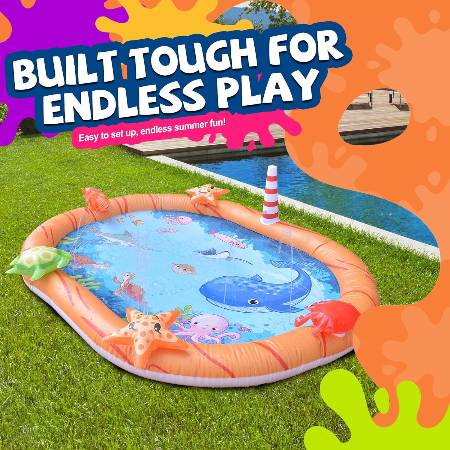 Excellent for Out of doors Enjoyable: With its vibrant design and spacious splash space, this splash pad is good for outside play within the backyard, yard, or park. It presents a enjoyable and refreshing approach for teenagers to chill off throughout sizzling climate.