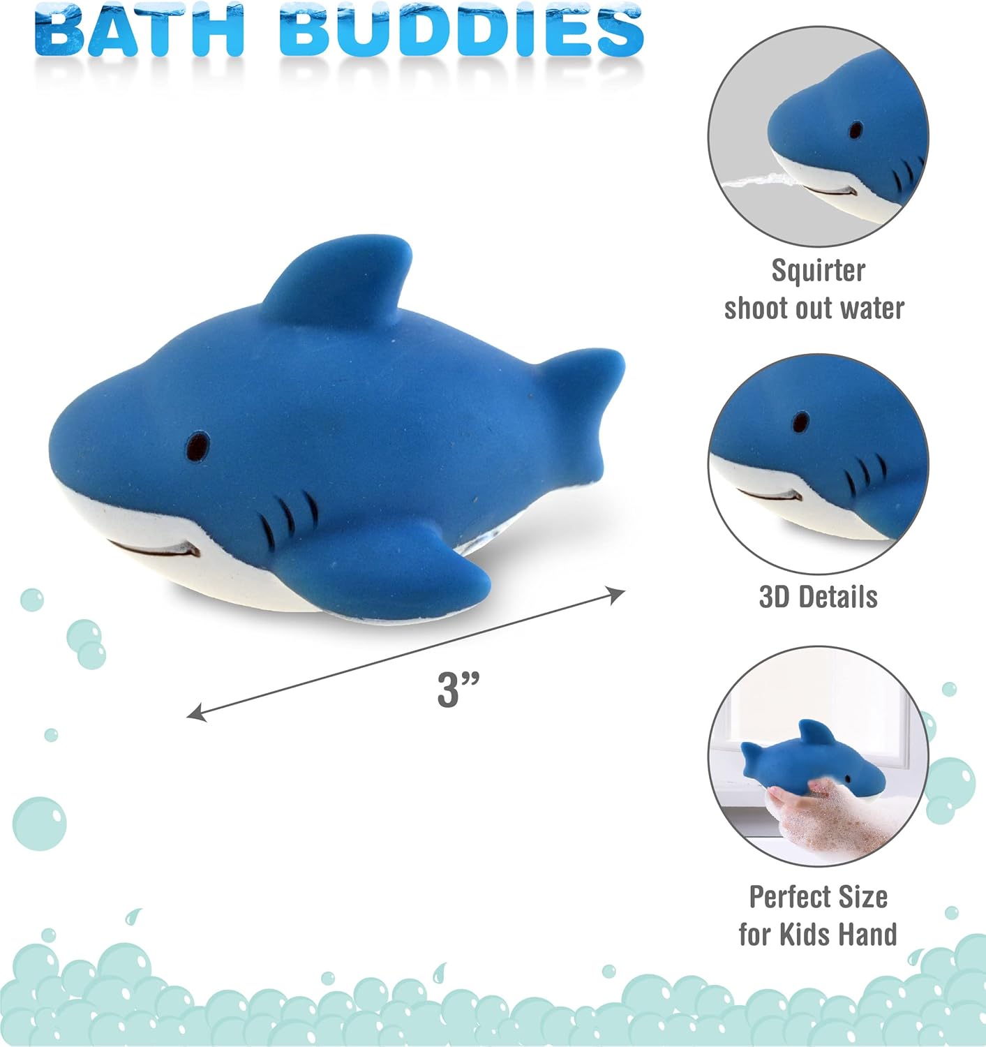 INCLUDED WITH THE PURCHASE OF BATH SQUIRTER TOY – Contains 1 Blue Shark Tub Buddy Squirter Toy for teenagers. The ocean life tub toy options easy, tender & rounded edges to make sure the security of youngsters whereas having fun with enjoyable water video games. Designed with tender rubber flippers, fins, & tail. The lovable blue shark shoots out water from a tiny gap when squeezed. Shark child float squirter toy measures round 3 inches, excellent match for infants’ little palms.