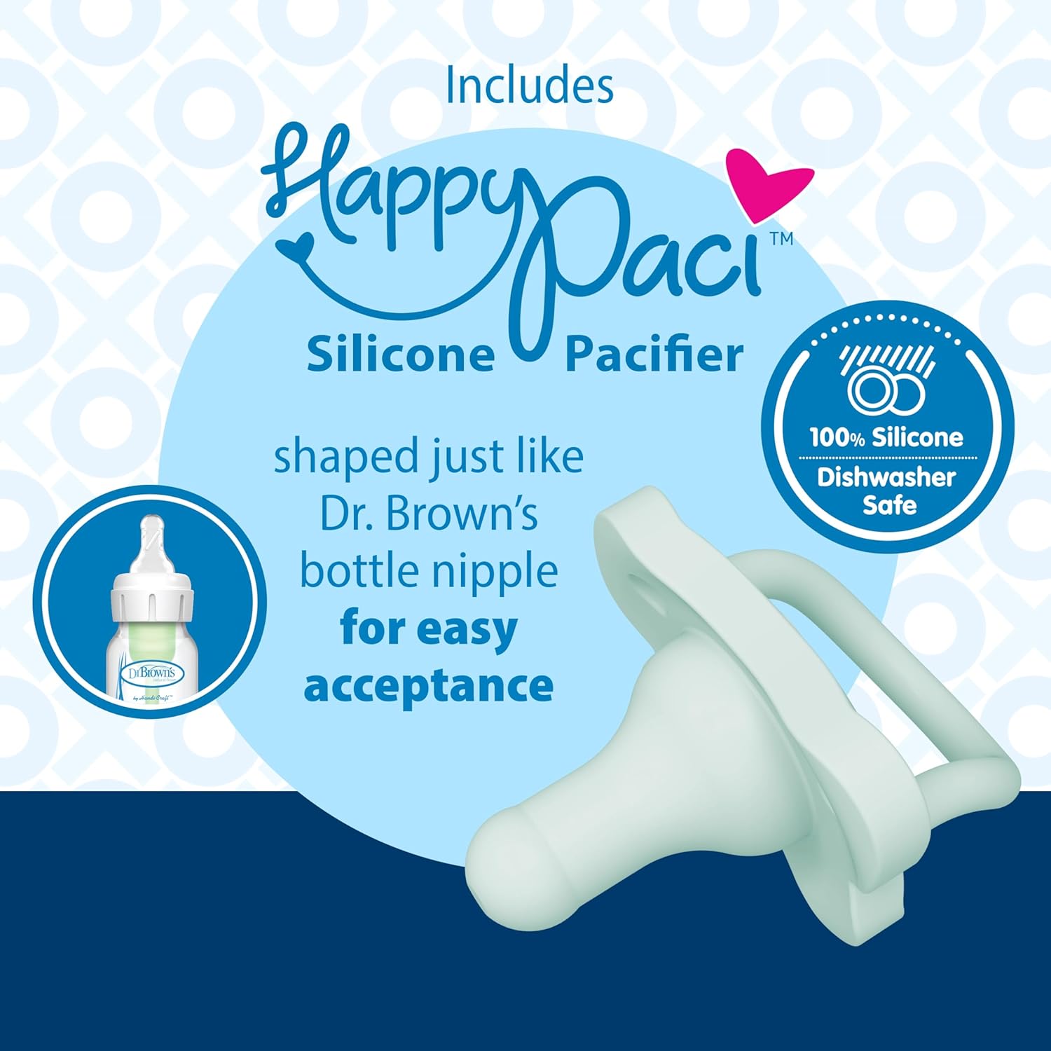 HAPPYPACI SILICONE PACIFIER. Soothe child with the comfortable 100% silicone pacifier within the acquainted form of Dr. Brown’s bottle nipple. Dishwasher (prime rack) and sterilizer protected. 0-6m.