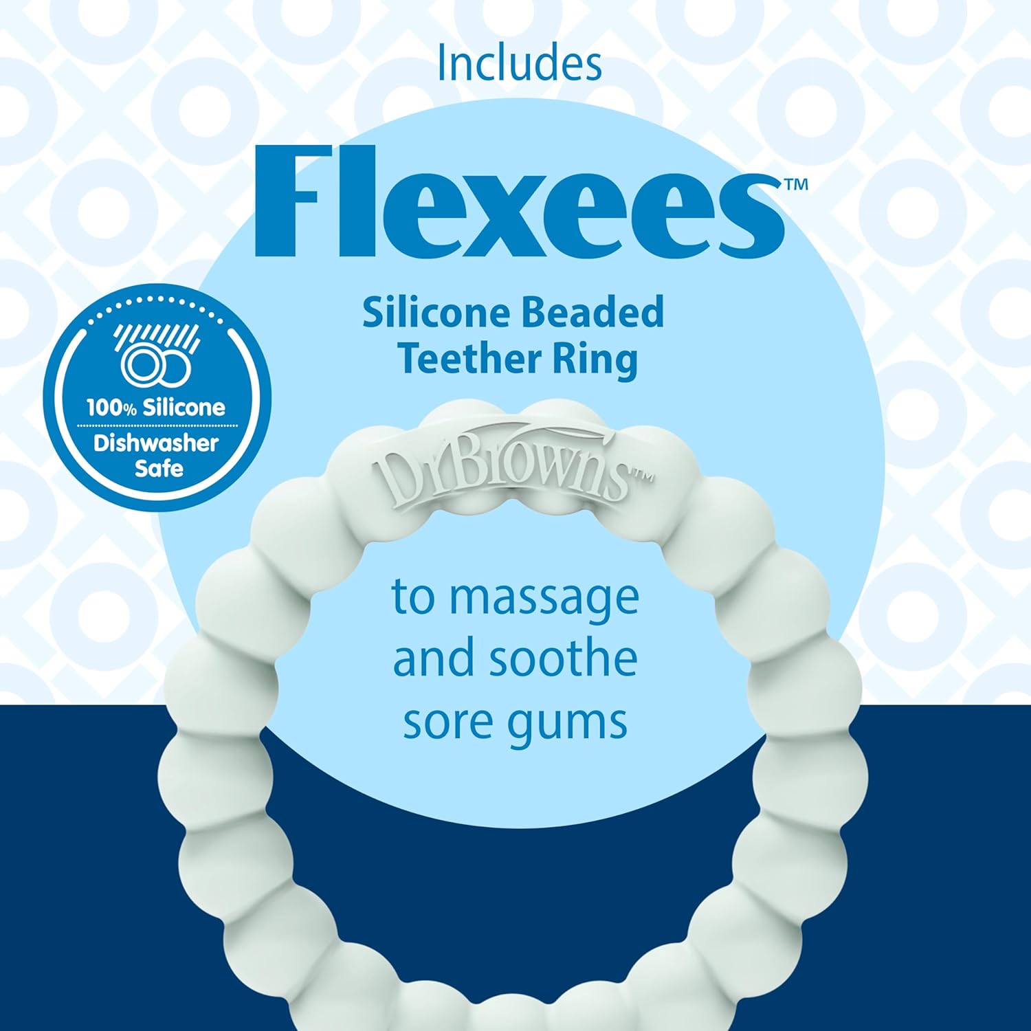 SILICONE BEADED TEETHER RING. Assist soothe child’s sore gums with the included fridge pleasant 100% silicone Flexees beaded teether ring. Dishwasher (prime rack) and sterilizer protected. 3m+.