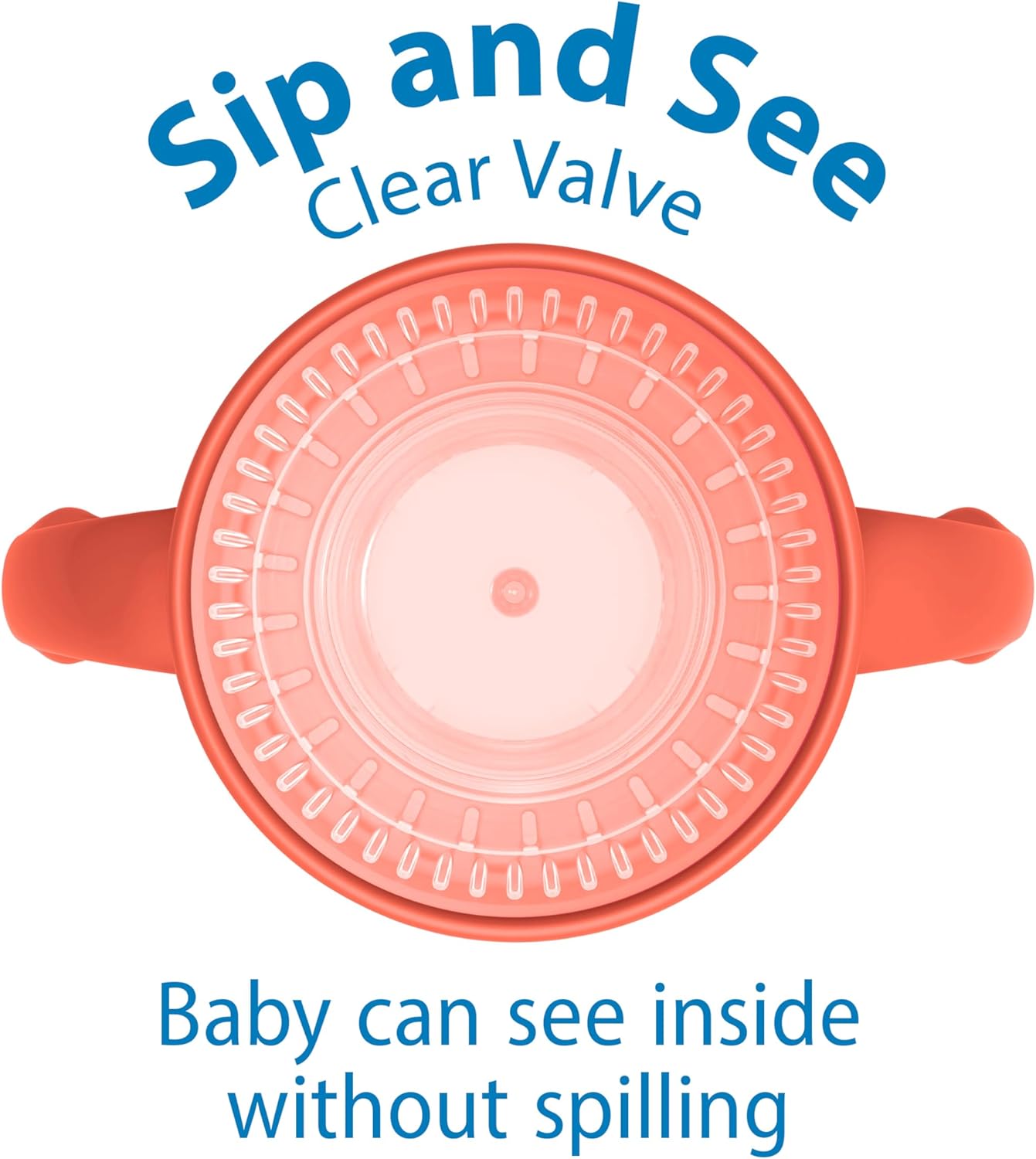 SEE INSIDE. The Sip and See Silicone Valve lets child see contained in the cup with out spilling.