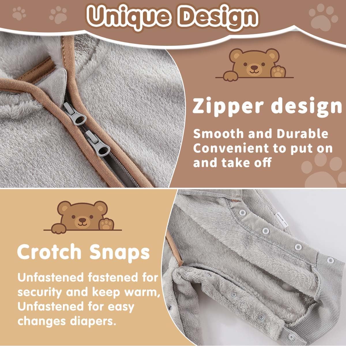 The infant winter coat with cute bear ears on the hood, makes your toddler look cute.
