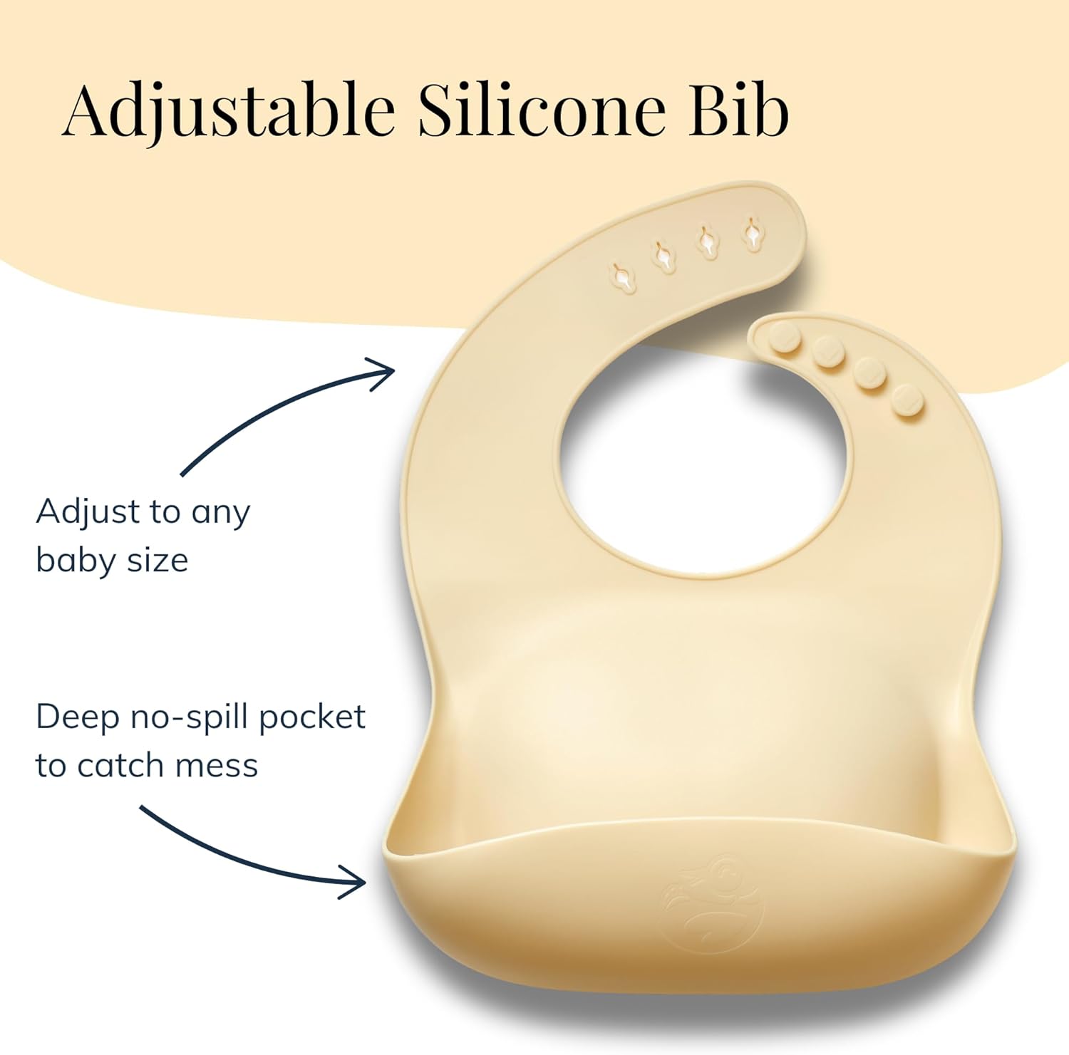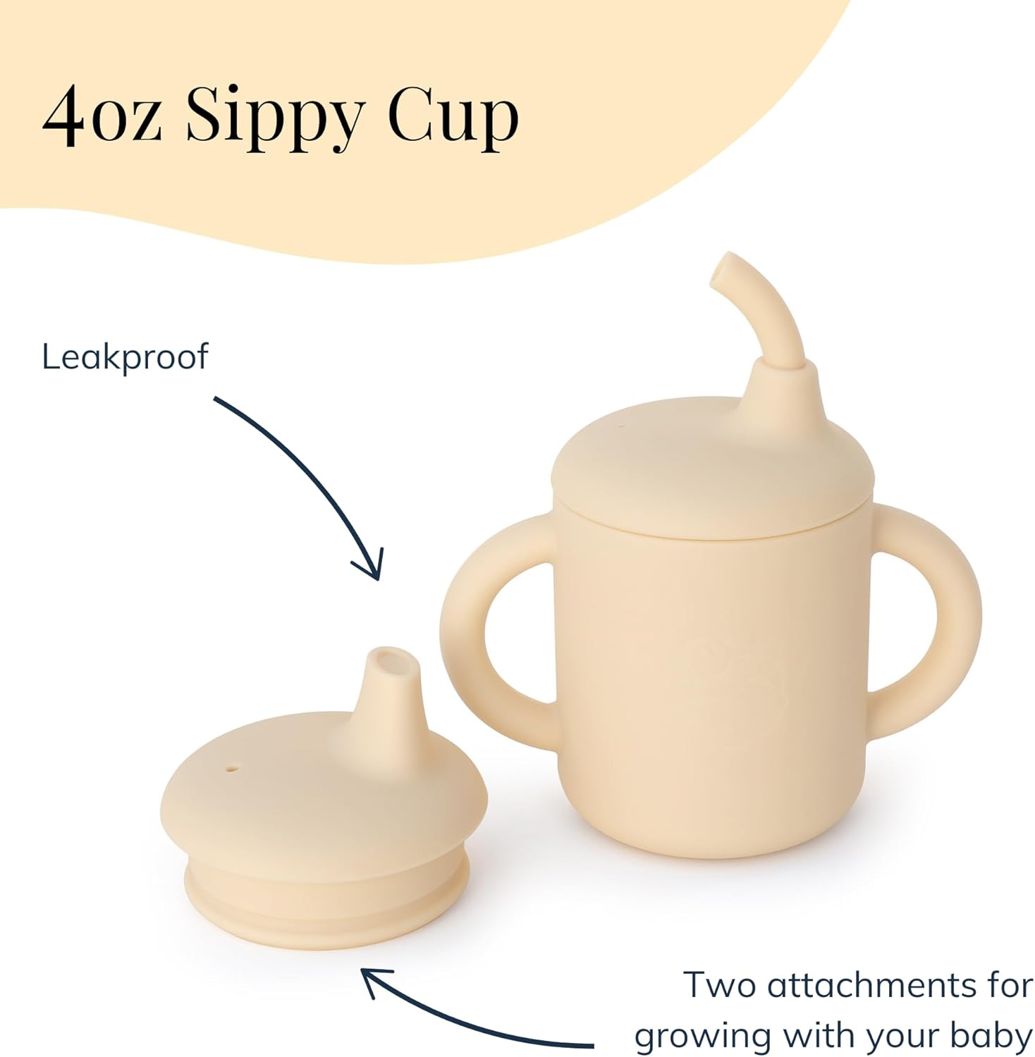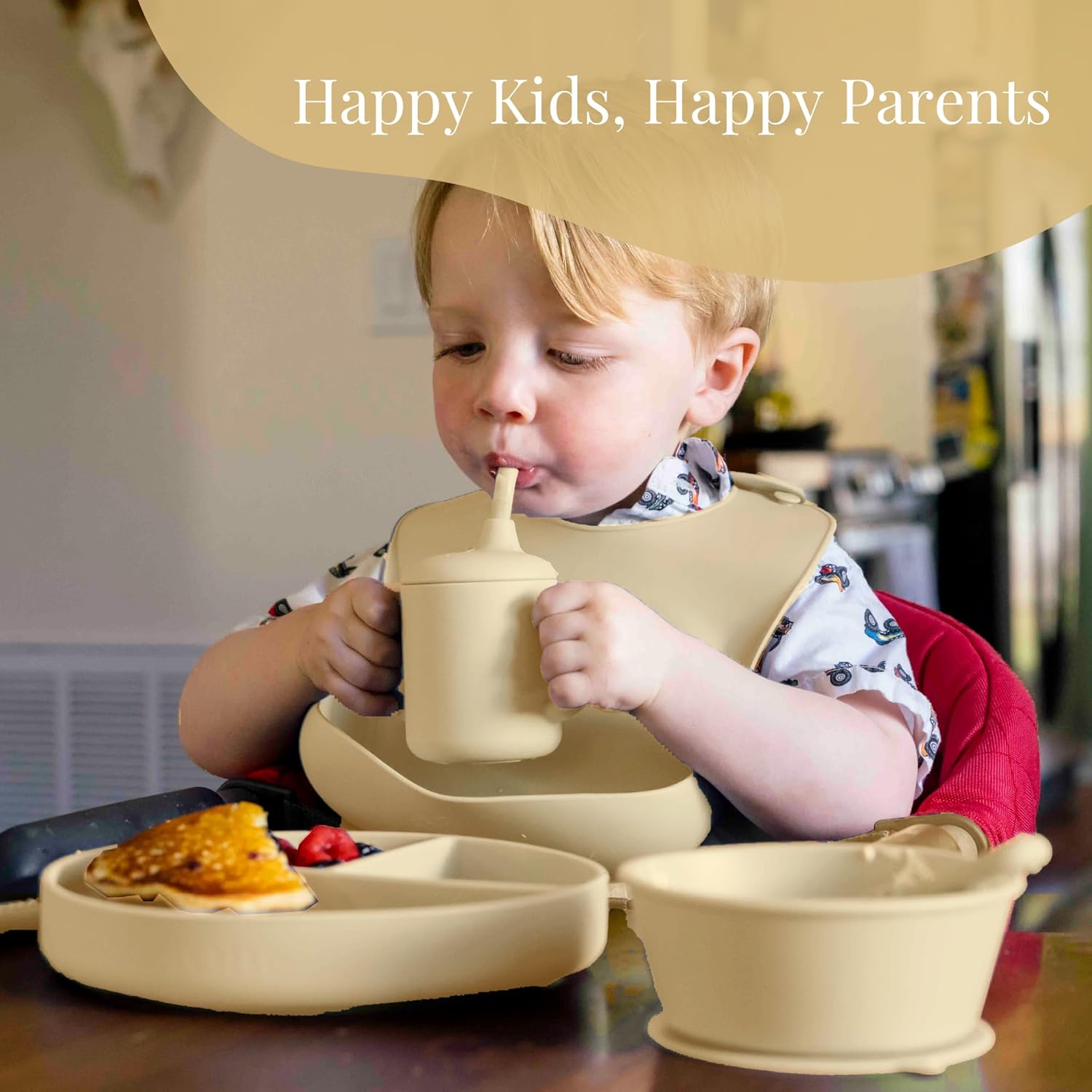 𝗟𝗜𝗧𝗧𝗟𝗘 𝗟𝗢𝗢𝗡 𝗕𝗔𝗕𝗬: For the Trendy Household – 100% non-toxic silicone set consists of (1) Silicone Bib, (2) Child Spoons (1) Suction Plate (1) Suction Child Bowl and (1) 4 oz Sippy Cup with (2) attachments.