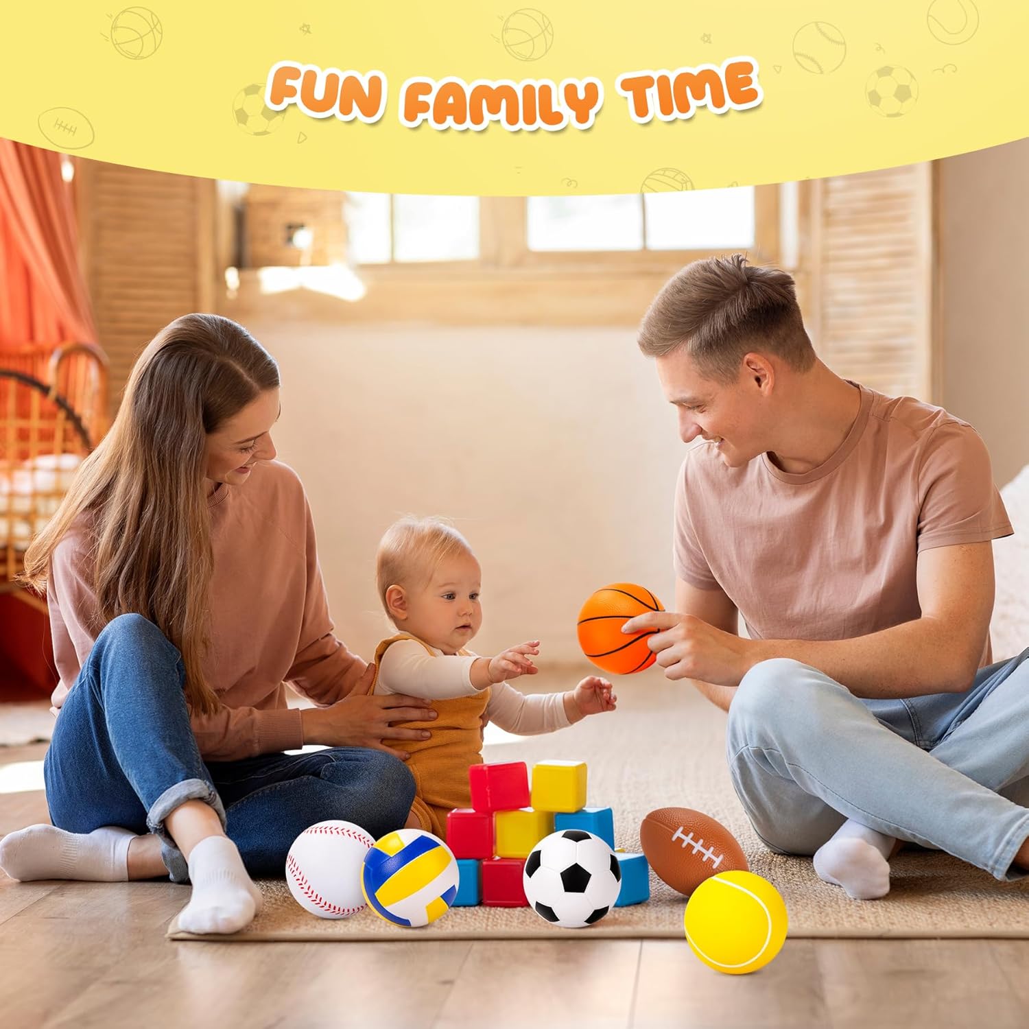 Full Delicate Sports activities Ball Set for Children – Contains 6 foam balls: soccer, basketball, soccer, baseball, volleyball, and tennis ball. Every ball is 3.5 inches, designed for small arms to grip, throw, and play safely. A enjoyable strategy to introduce youngsters to sports activities.