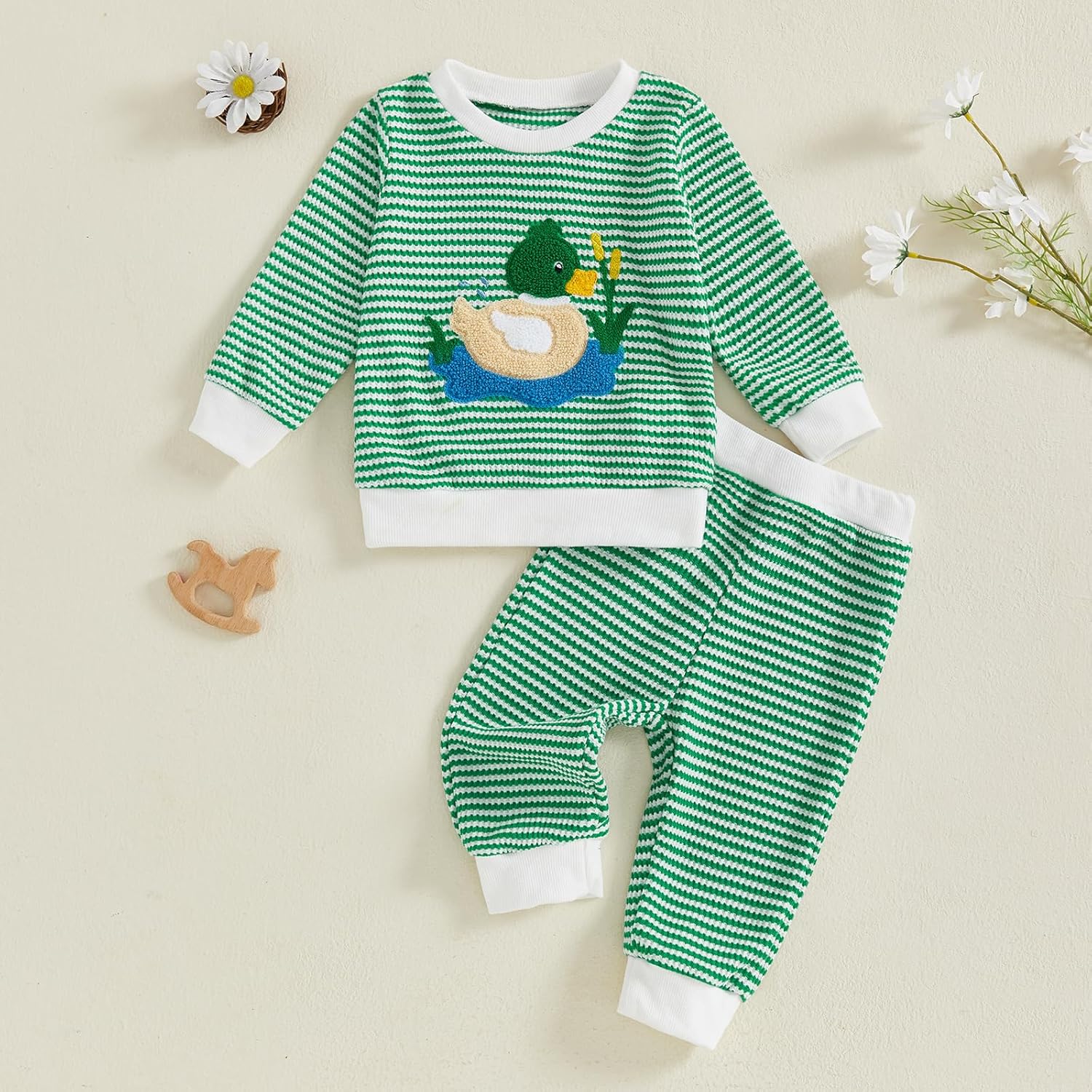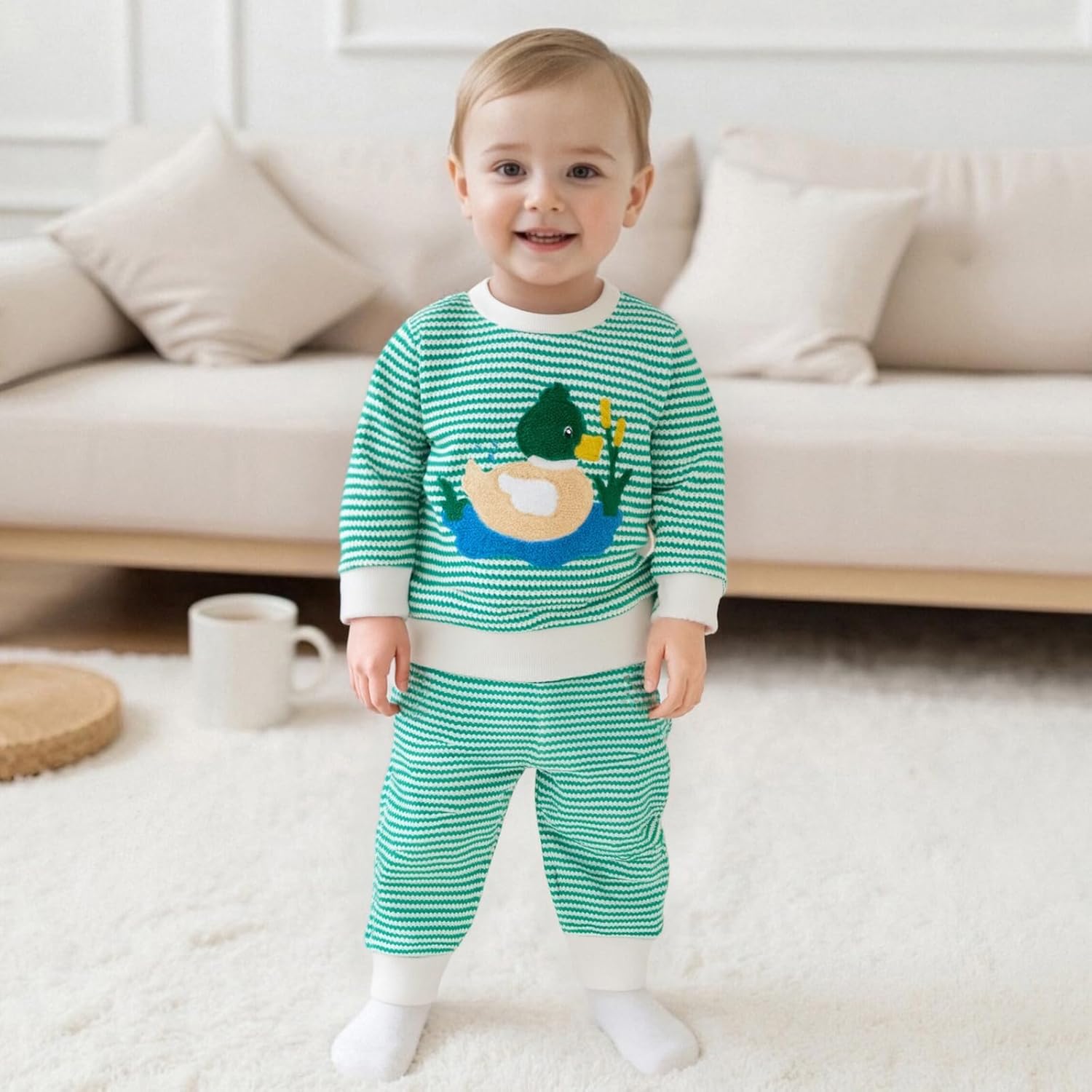 Toddler Child Boy Winter Fall Outfit Striped Duck/Truck Embroidered Lengthy Sleeve Sweatshirt Elastic Waist Pants 2 Piece Set