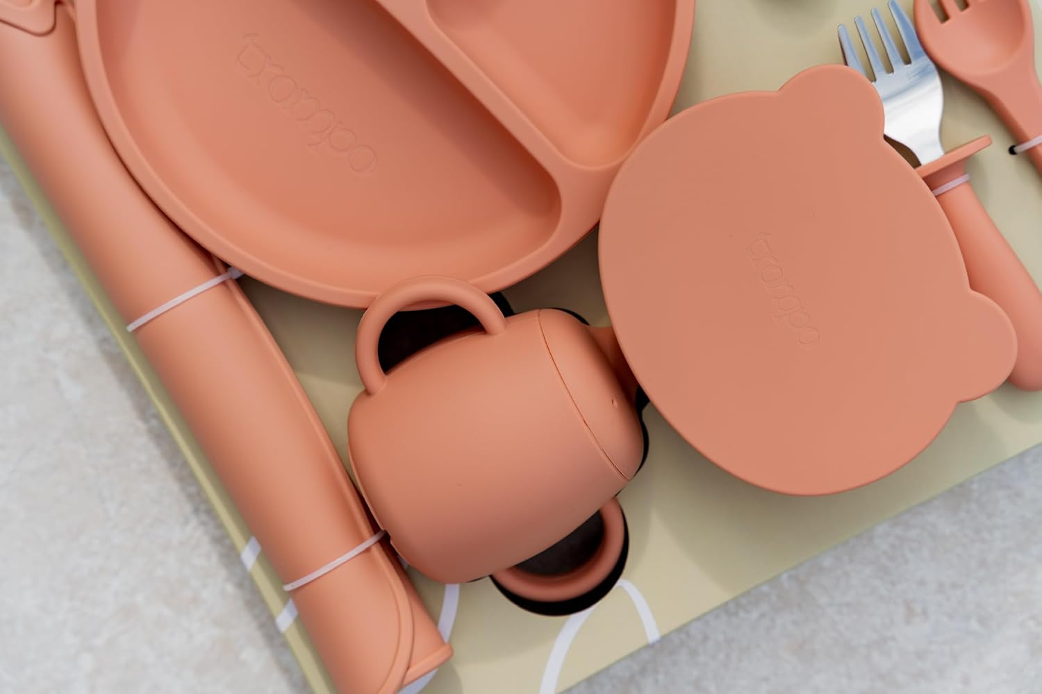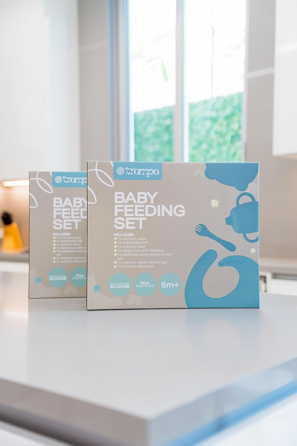 Trompo 100% Meals-grade Silicone Child Feeding Set, is secure, tender and simple to scrub, microwave and dishwasher secure. BPA-free, PVC-free, phthale-free. tender and mild for delicate gums. The multi functional set contains: suction plate, adjustable bib, suction bowl, sippy cup with handles, chrome steel spoon & fork, silicone spoon & fork, suction placemat.