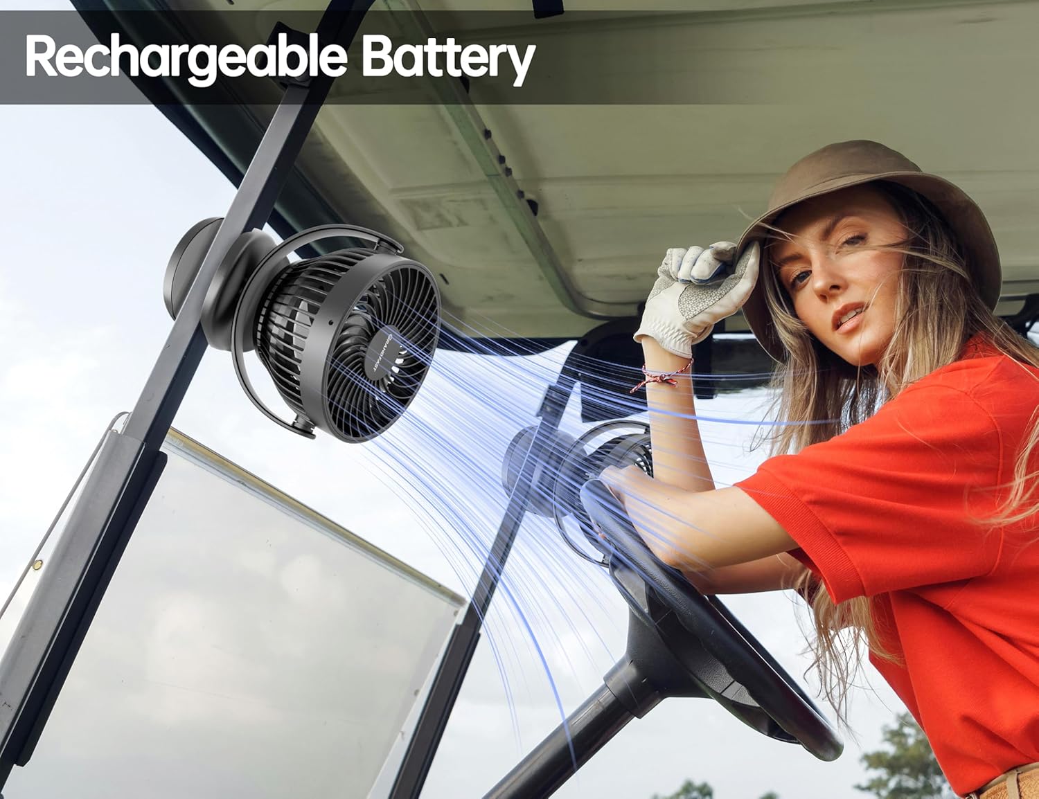 Rechargeable Battery: With a 4000mAh battery, this golf cart fan runs as much as 13 hours on low and absolutely fees in simply 3 hours, 4 indicator lights maintain you knowledgeable of energy ranges for well timed recharging, guaranteeing consolation and efficiency all through your recreation