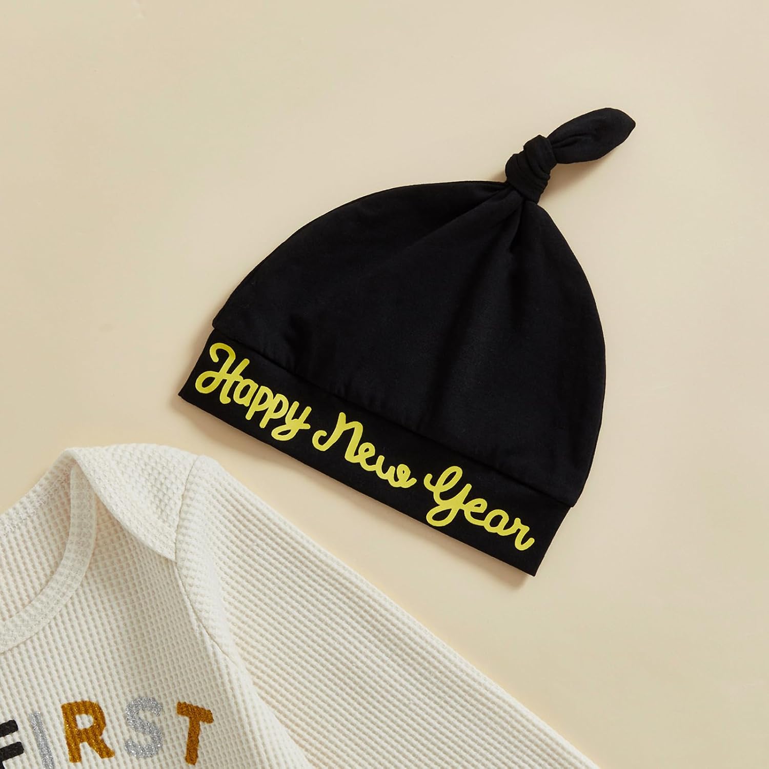 Child New 12 months Outfits Bottle Letter Print Lengthy Sleeve Spherical Neck Romper with Hat 2 Pcs Set