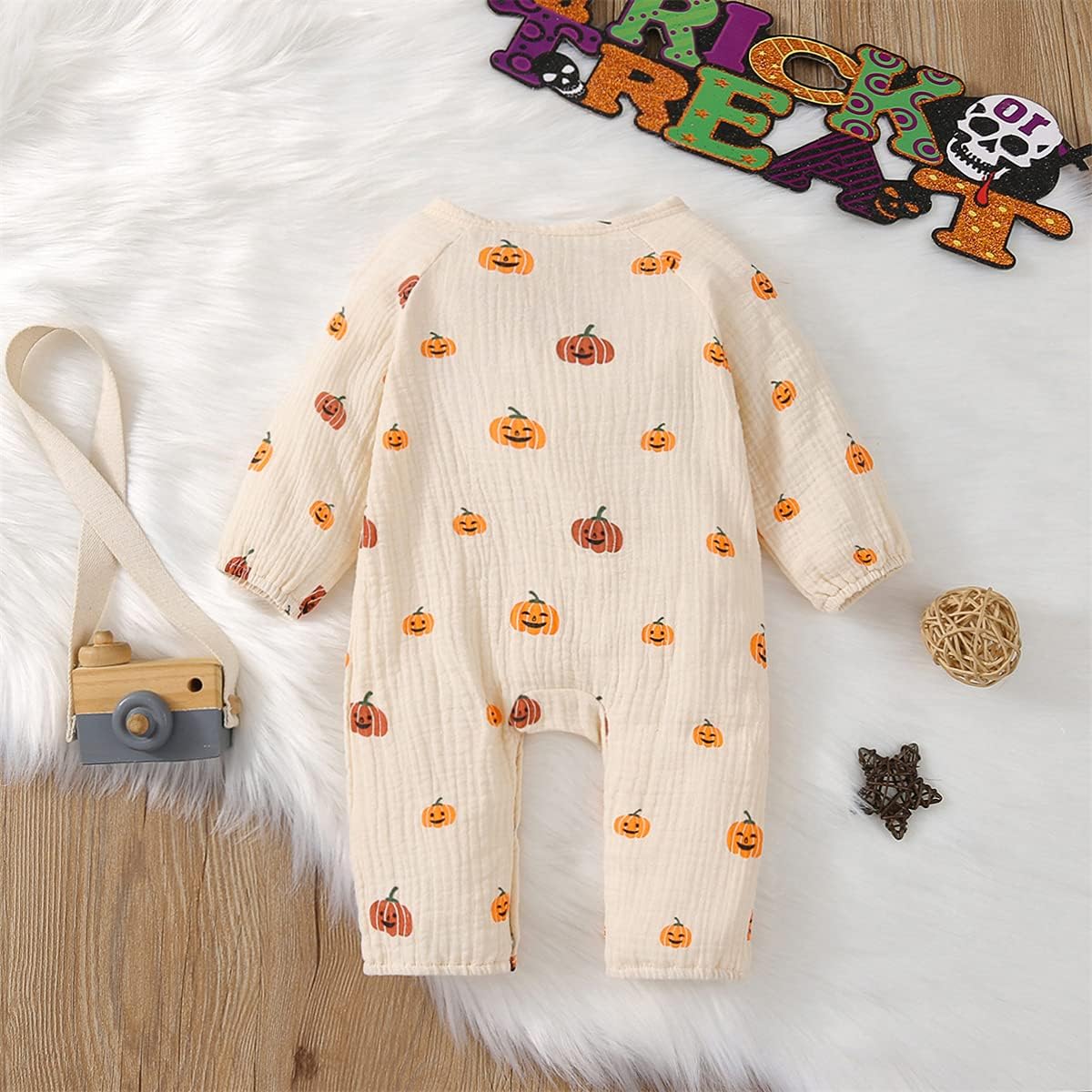 Child Halloween Jumpsuit, Pumpkin Print O-Neck Lengthy Sleeve Romper with Buttons for Toddler Women, Boys