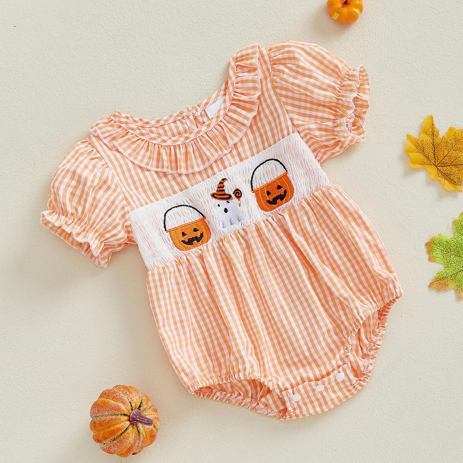 New child Toddler Child Lady Bubble Romper Puff Sleeve Ruffle Collared Pumpkin Ghost Embroidery Smocked Gingham Jumper