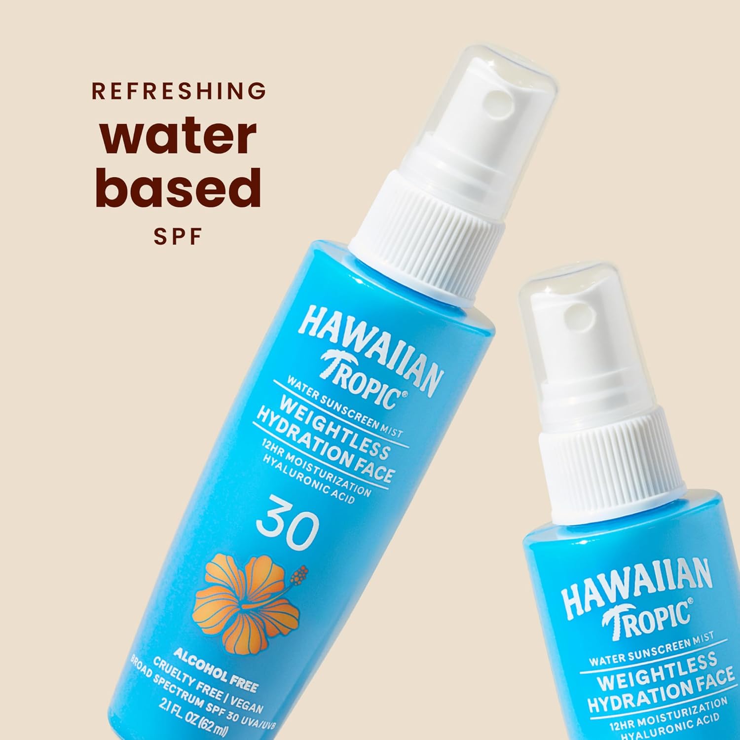 1X HAWAIIAN TROPIC SUNSCREEN WATER MIST FACE SPF 30: A light-weight spray sunscreen made with hyaluronic acid that leaves your pores and skin feeling hydrated and glowing. Water and sweat resistant, fast-absorbing, with broad spectrum UVA/UVB safety