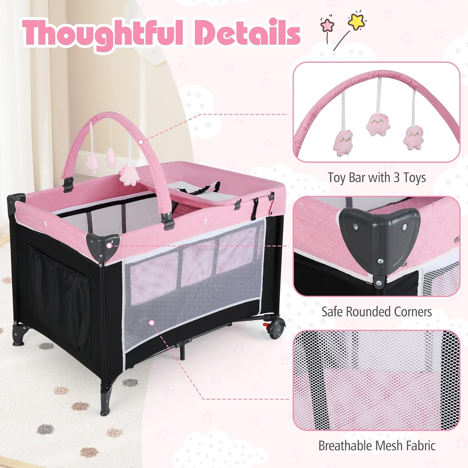 Additional Storage & Enjoyable: The child pack and play is designed with a aspect storage pocket for important child objects, together with a folding mat for added consolation. Plus, a detachable toy bar with 3 fluffy toys is hooked up to entertain your infant throughout their time within the playard.