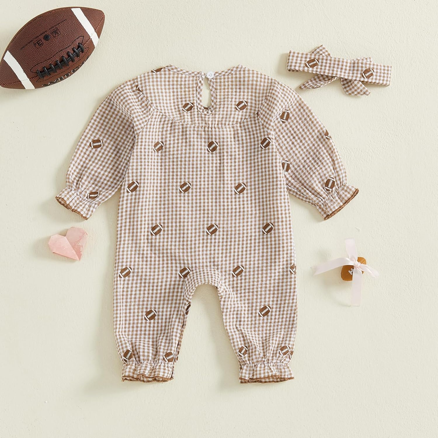 Child Ladies Fall Romper Plaid Print Soccer Embroidery Lengthy Sleeve Spherical Neck Jumpsuit with Headband