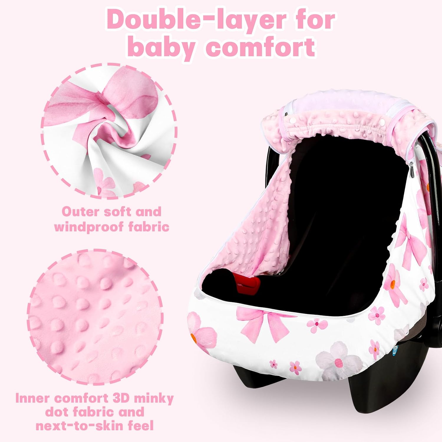All-Season Consolation & Safety: Produced from light-weight, sturdy materials with a mushy, snug minky dot material internal layer, this carseat cowl affords heat in winter and breathability in summer season. It additionally offers efficient safety from wind, rain, and solar, guaranteeing year-round consolation