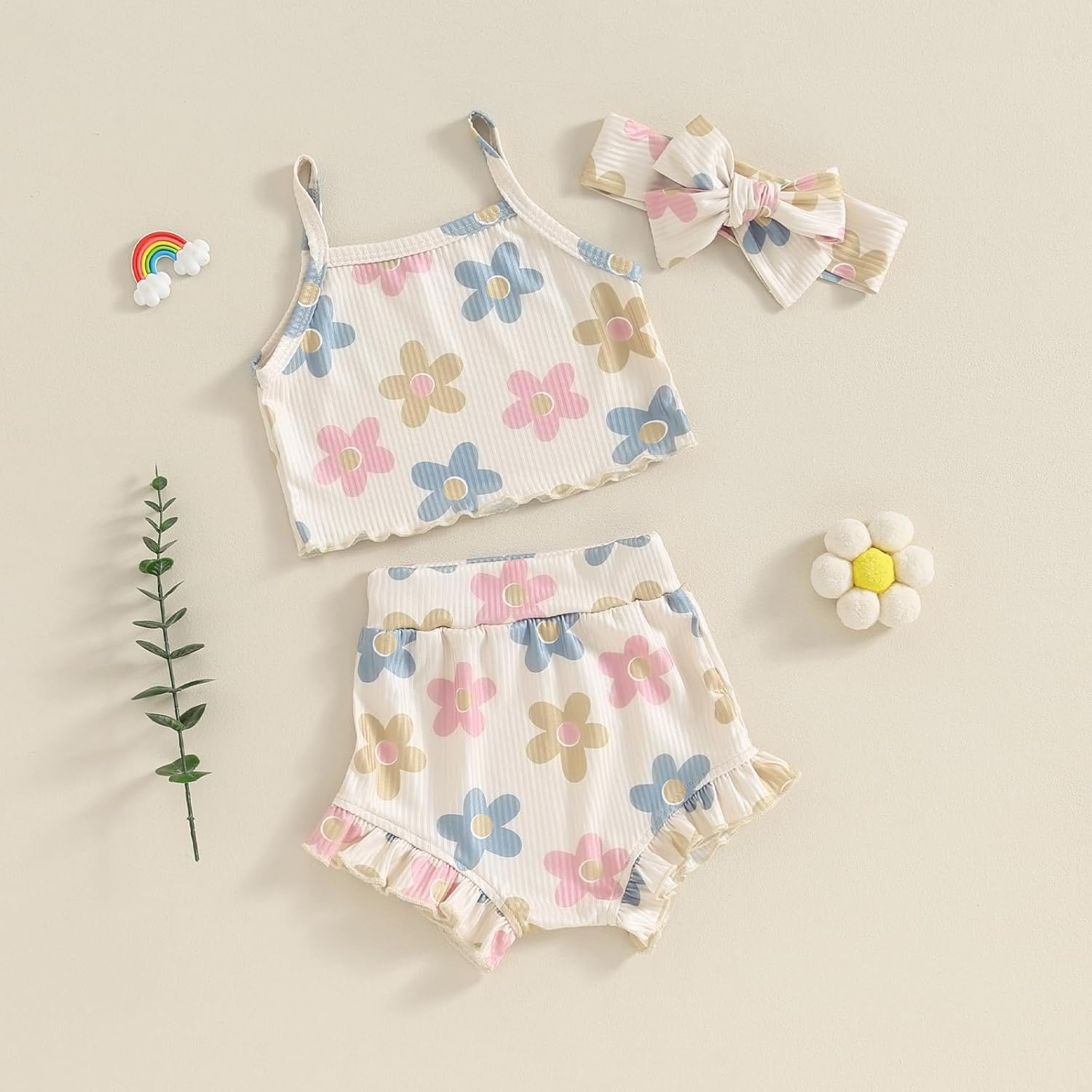 Cute outfit for toddler ladies with floral print. Child lady camisole with spaghetti straps and sleeveless design. Child lady shorts with ruffle hem, elastic waist design, and headband set, your toddler will obtain plenty of compliments carrying it.