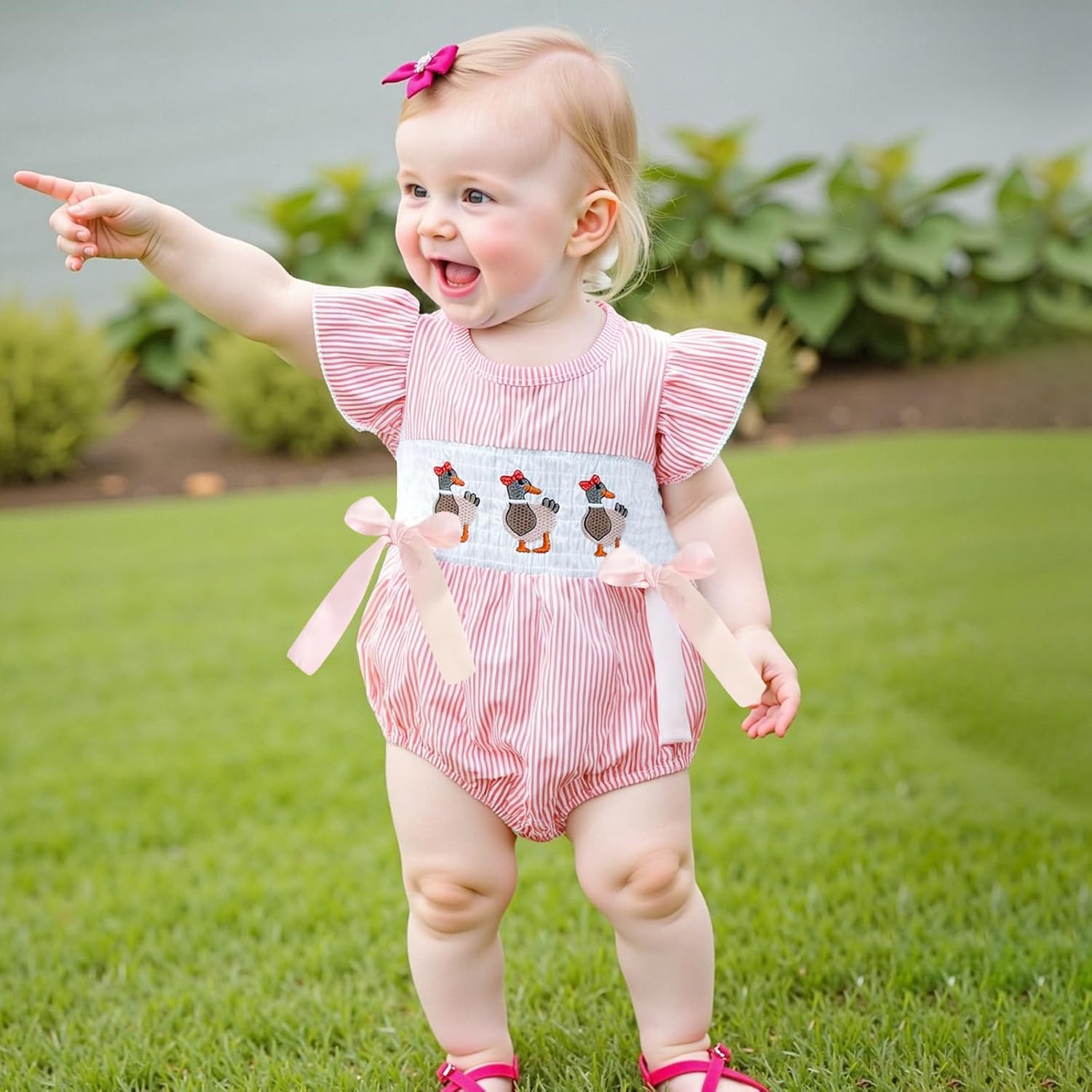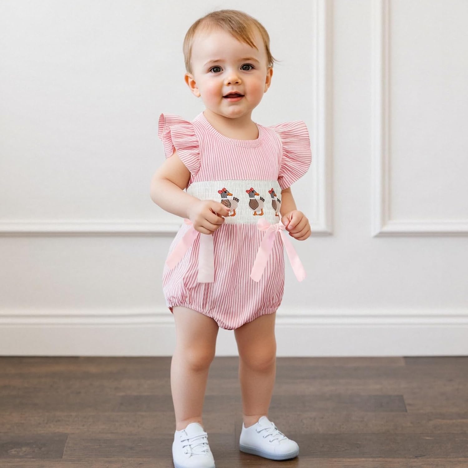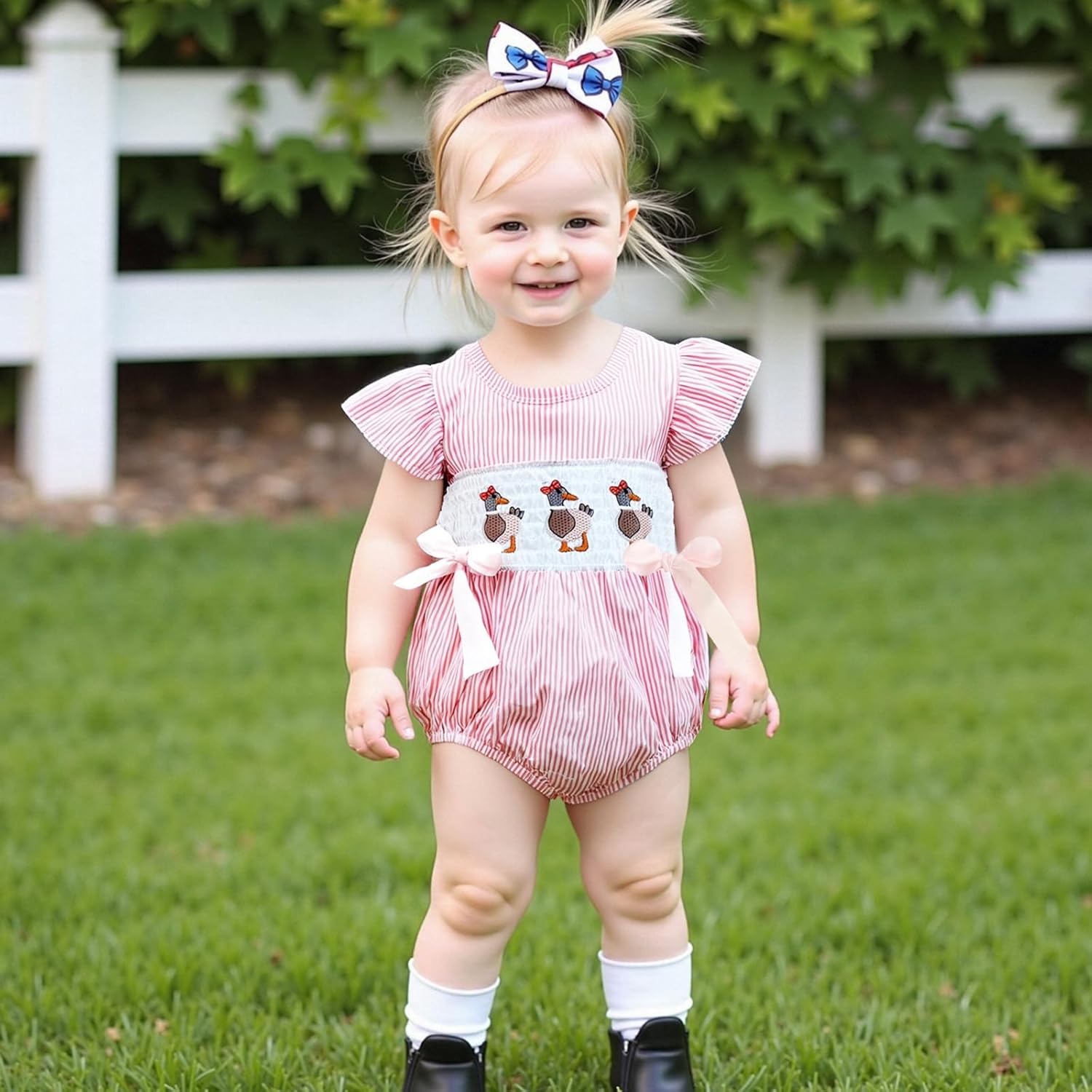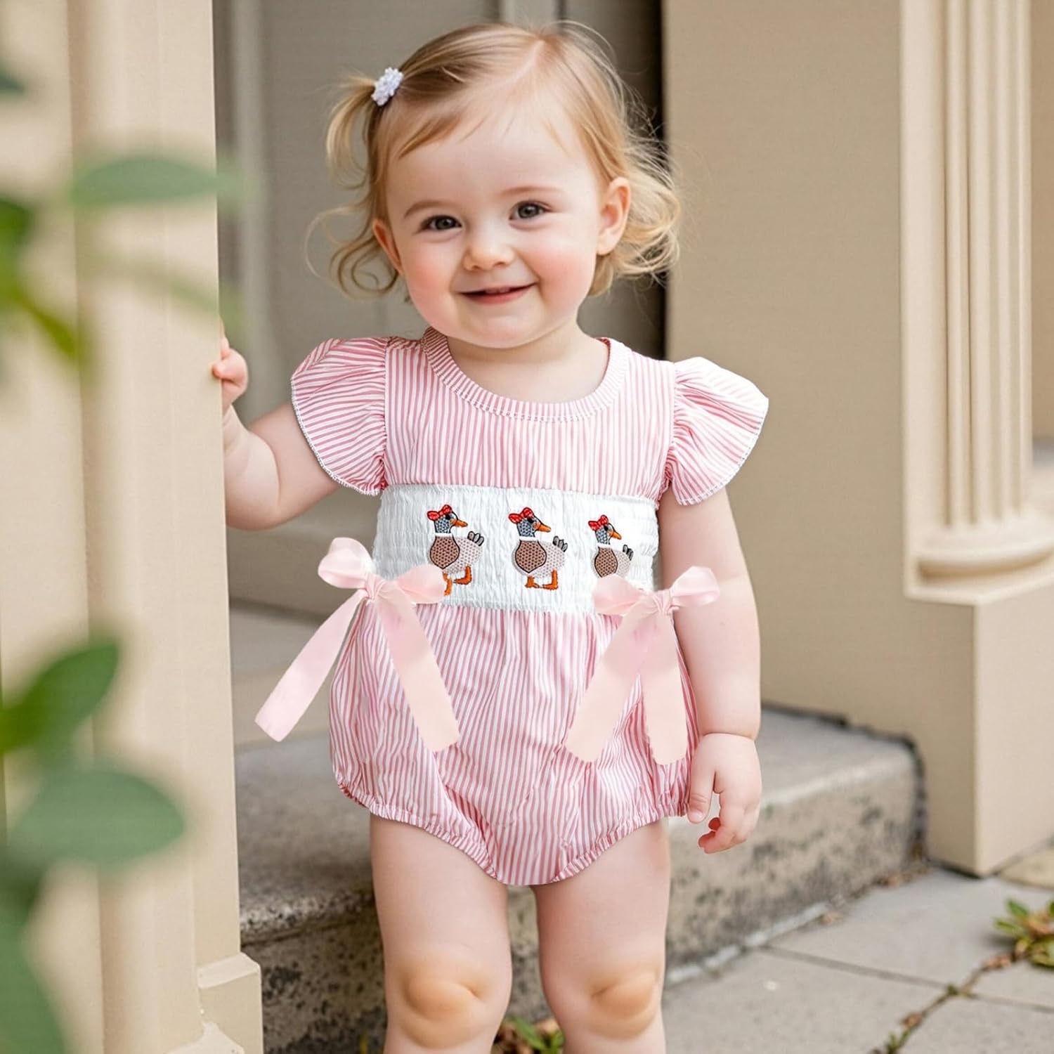 Child Lady Duck Embroidery Romper Brief Sleeve Spherical Neck Striped Jumpsuit with Bow Decor