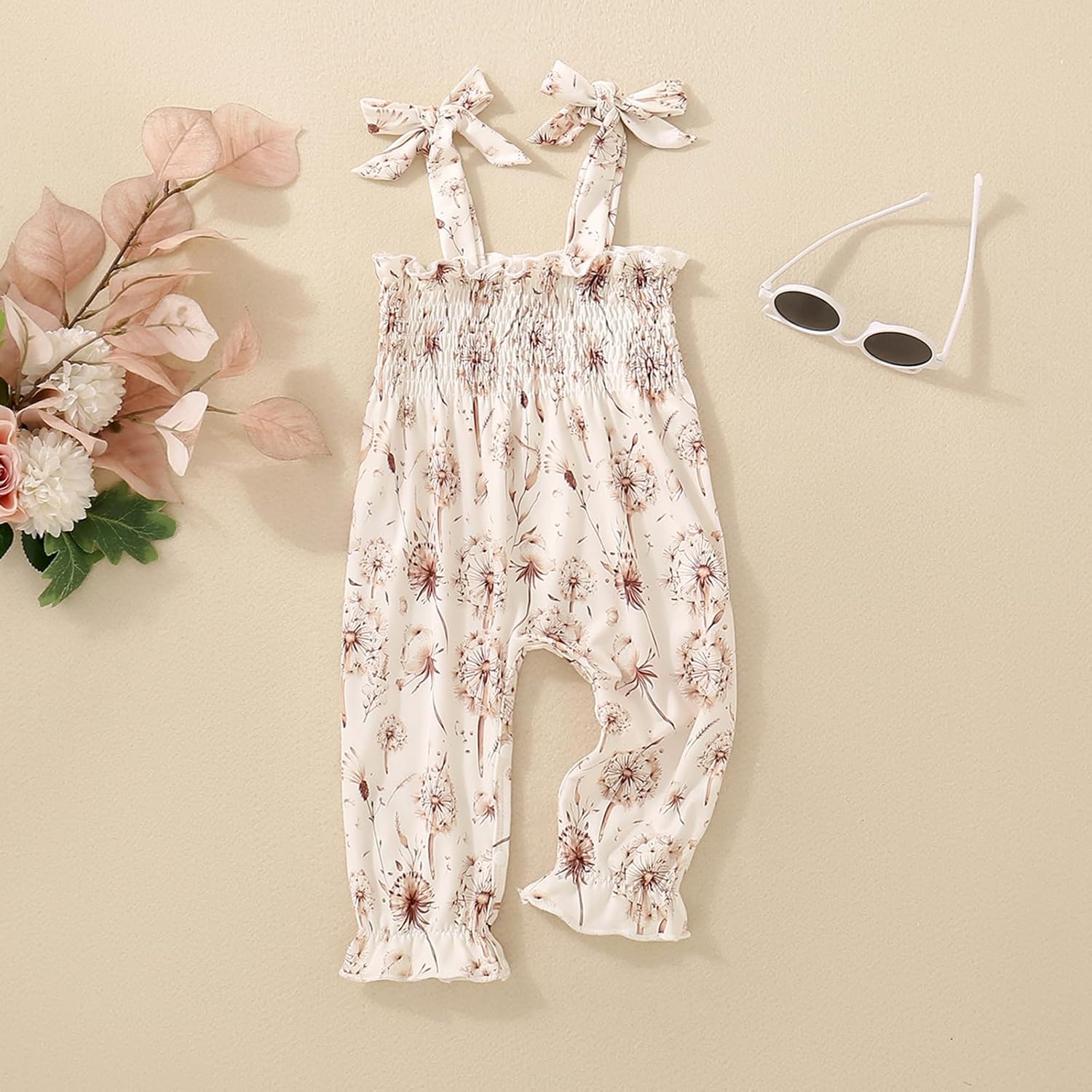 Infant Baby Girls Outfit Ruched Flower Print Jumpsuit Tie Up Sleeveless Romper Overall Pants Summer Clothes One Piece