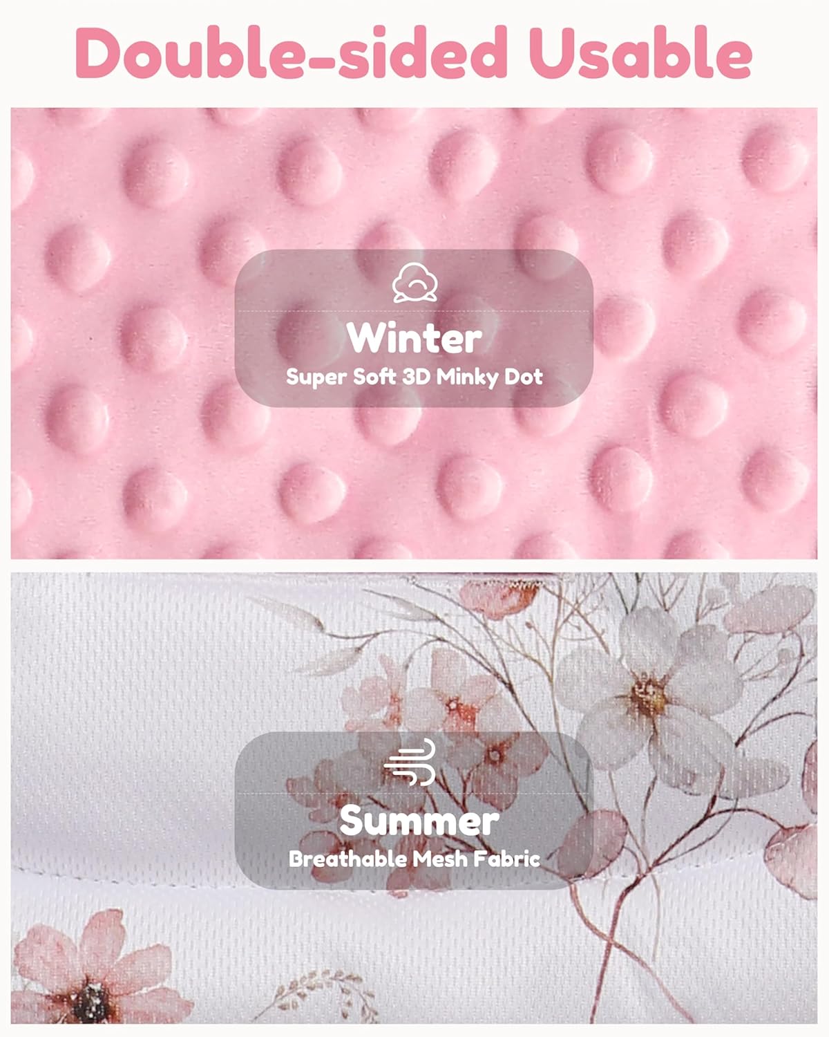 Double-Sided, Consolation for ALL Seasons: Delicate Minky Dotted Plush cloth on entrance facet (cozy for winter) + breathable mesh cloth on again facet (cool for summer time). Cute prints stimulate sensory growth. Light on pores and skin and excellent for highway journeys, park walks, or indoor rocker