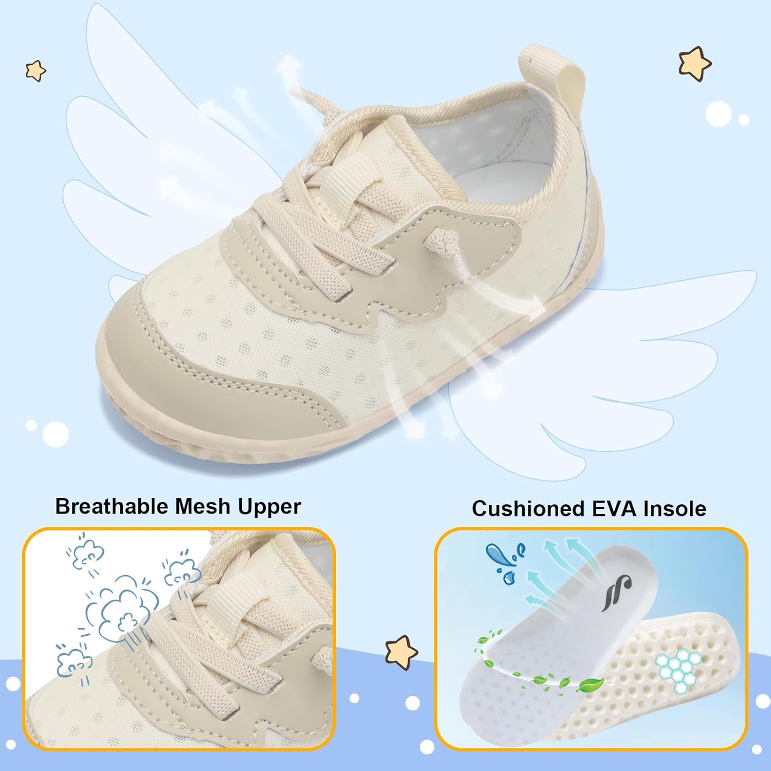 Swim Sneakers for Toddler characteristic mushy mesh higher(with drainage holes) weighs 36g every shoe, tremendous light-weight as a feather whereas offering nice safety, excellent to be toddler’s day by day strolling sneakers