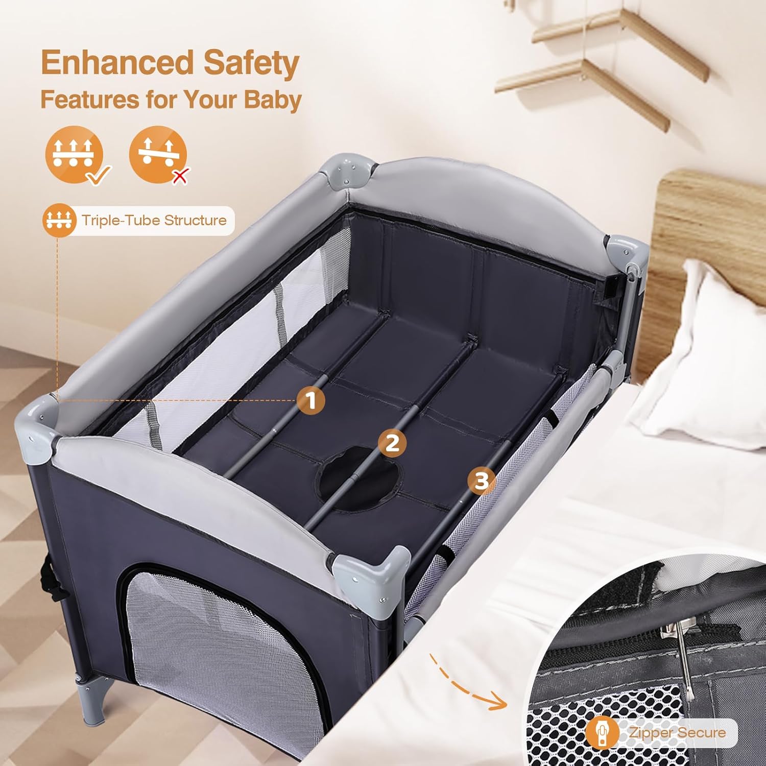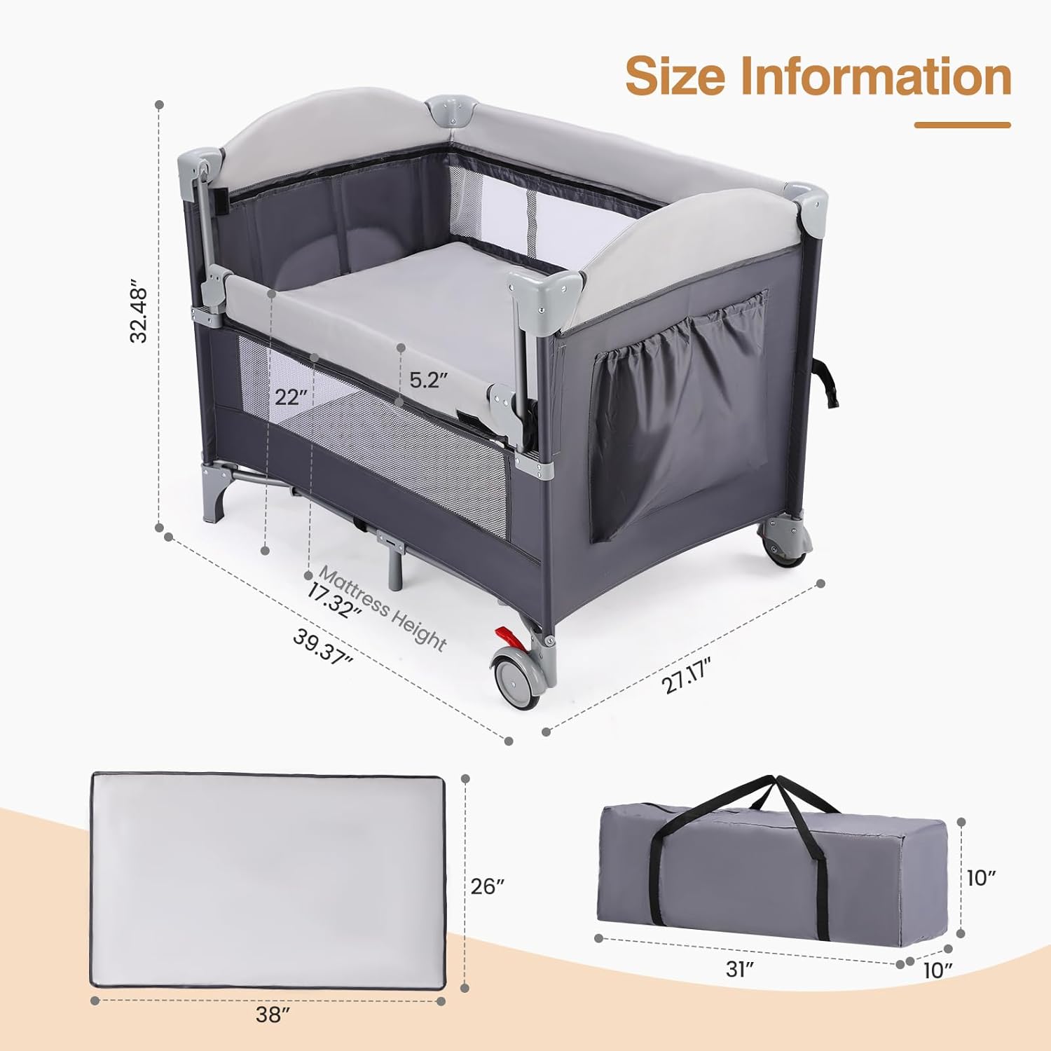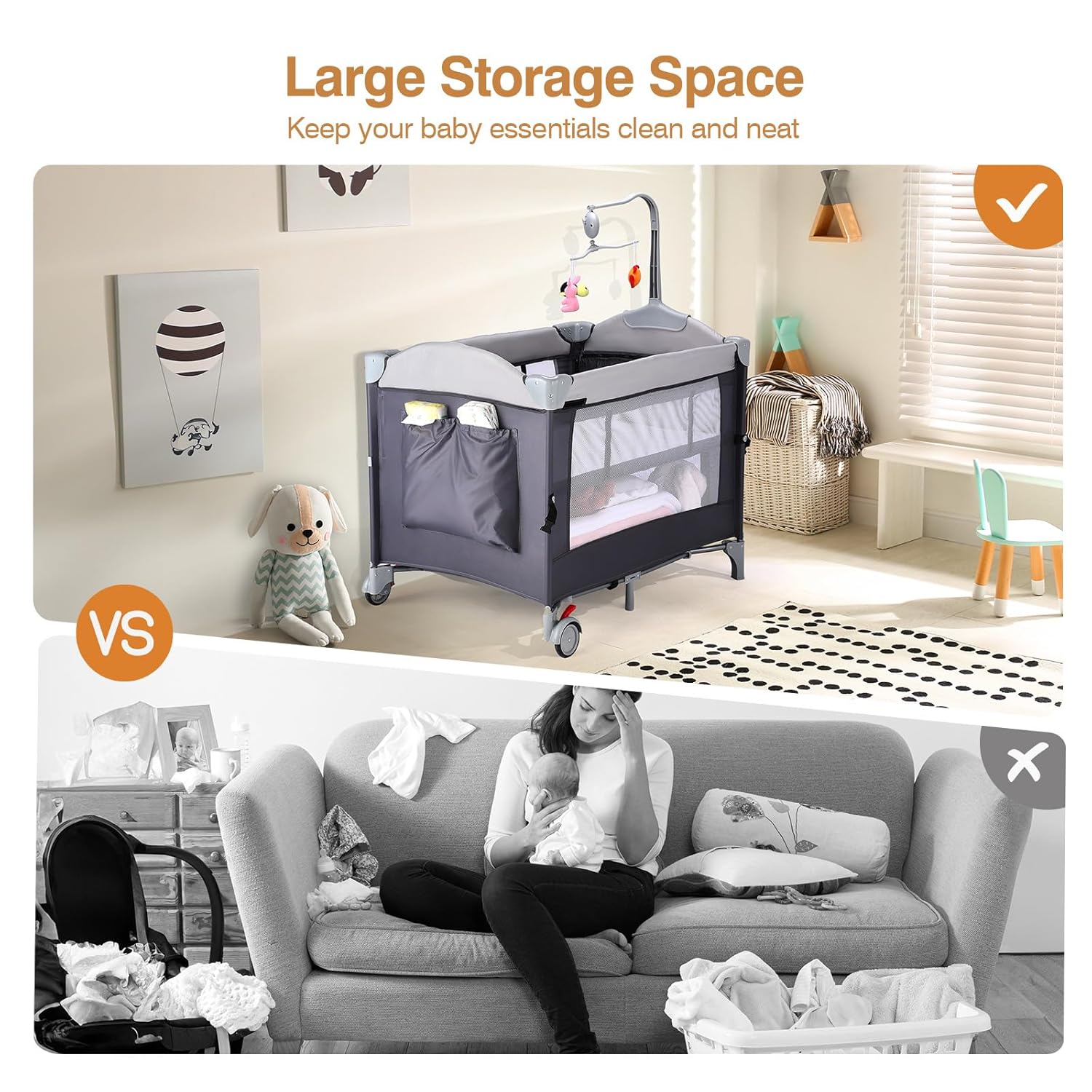 Handy Bedside Bassinet Mode: When used as a bedside bassinet, the one aspect rail will be adjusted to a decrease peak, permitting the bassinet to securely connect to your grownup mattress. This design makes it simple for mothers to care for his or her child through the night time, offering peace of thoughts and conserving your toddler shut always. Whether or not at dwelling or on the go, this Pack and Play ensures your child is at all times by your aspect