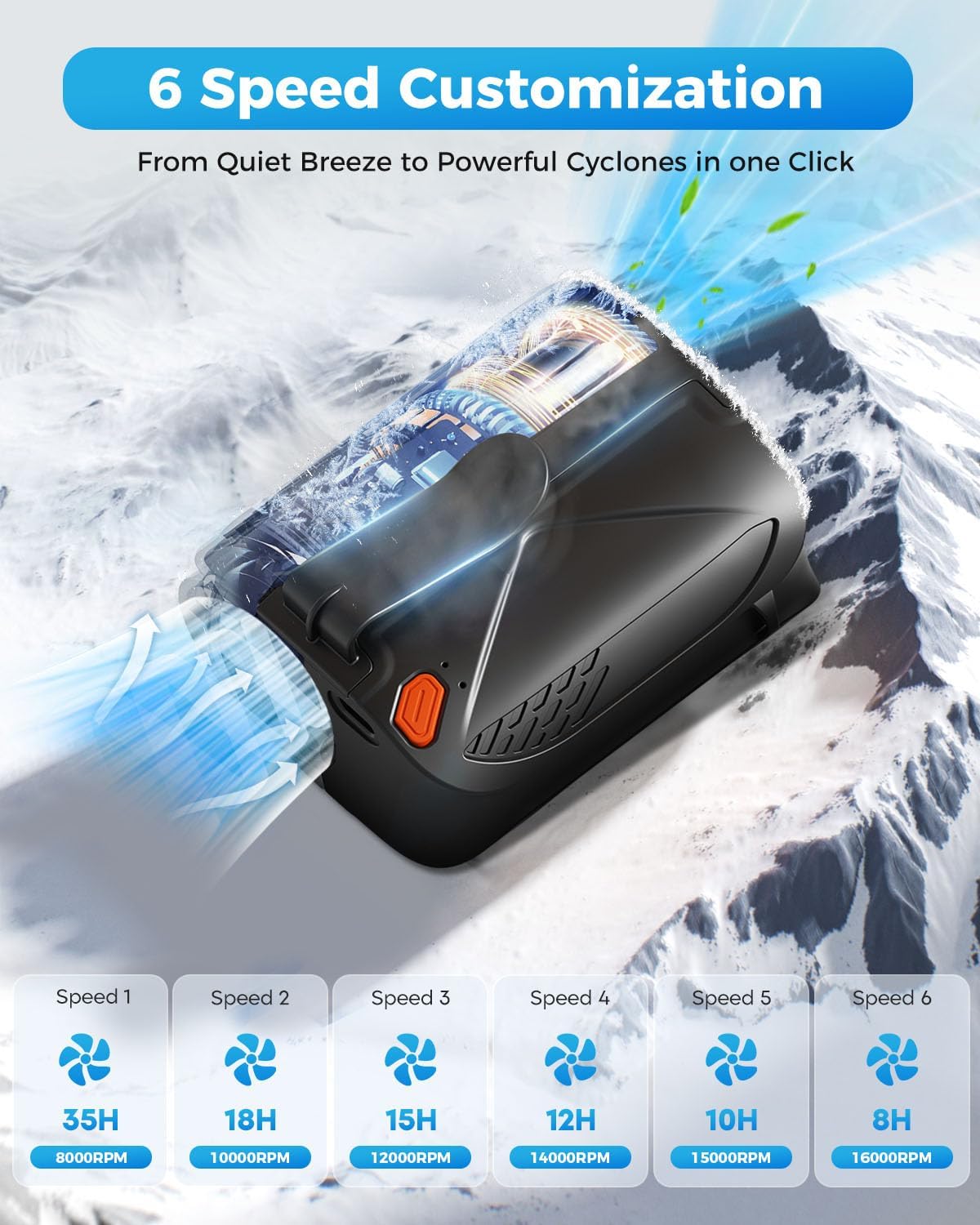 6-Velocity Adjustable Turbo Airflow: Customise your consolation with 5 distinct pace settings. Whether or not you want a delicate breeze or a robust gust, the high-speed brushless motor and precision-engineered 5-blade turbo fan can spin as much as 16,000 RPM, producing airflow speeds of as much as 30 ft/s. Keep refreshed with customized, on-demand cooling.