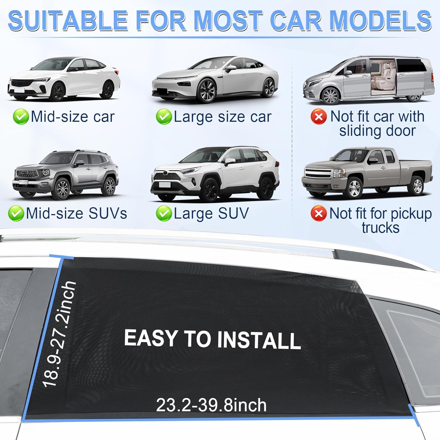 ćUniversally relevantćThis automobile window sunshade internet has good elasticity and is appropriate for aspect home windows with a size of 23.2-39.8 inches and a top of 18.9-27.2 inches. Appropriate for many vehicles, SUVļ¼ The rear window of a industrial automobile