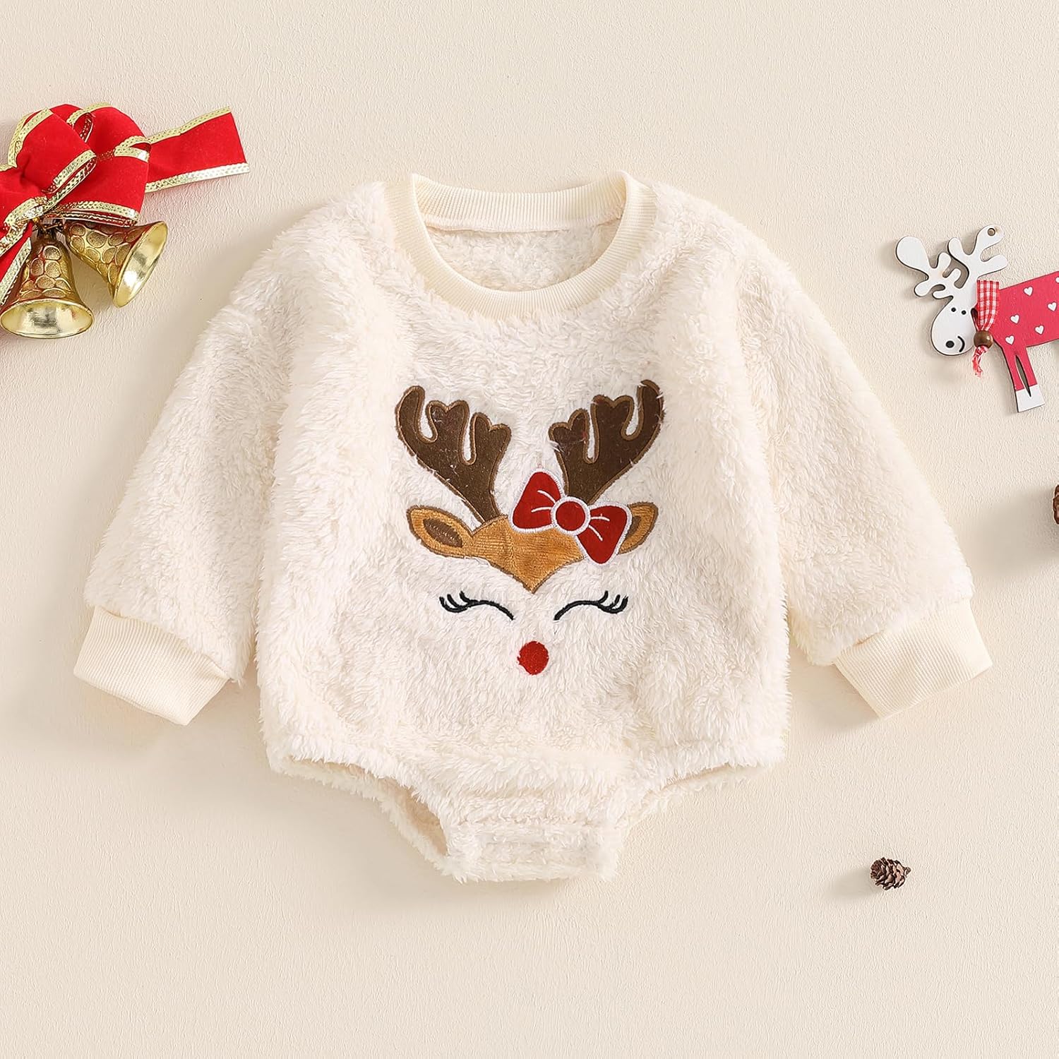 Child Boy Woman Christmas Outfit Fleece Jumpsuit Cute Elk Bowknot Embroidered Spherical Neck Lengthy Sleeve Romper Lovable Bodysuits