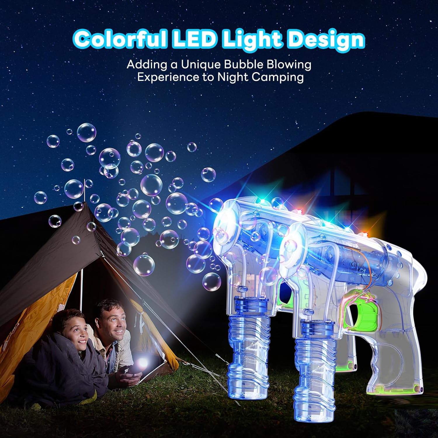 Fascinating LED Lighting: Every bubble gun for toddlers boasts three vibrant LED lights that, with a easy set off pull, launch a cascade of colourful bubbles illuminated by the LEDs. This enhances the visible enchantment of the bubble toy, effortlessly making a cheerful and fun-filled environment