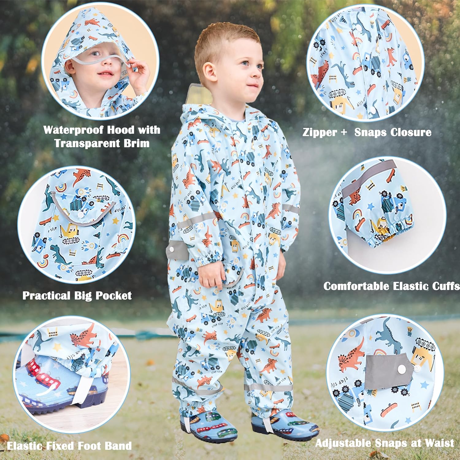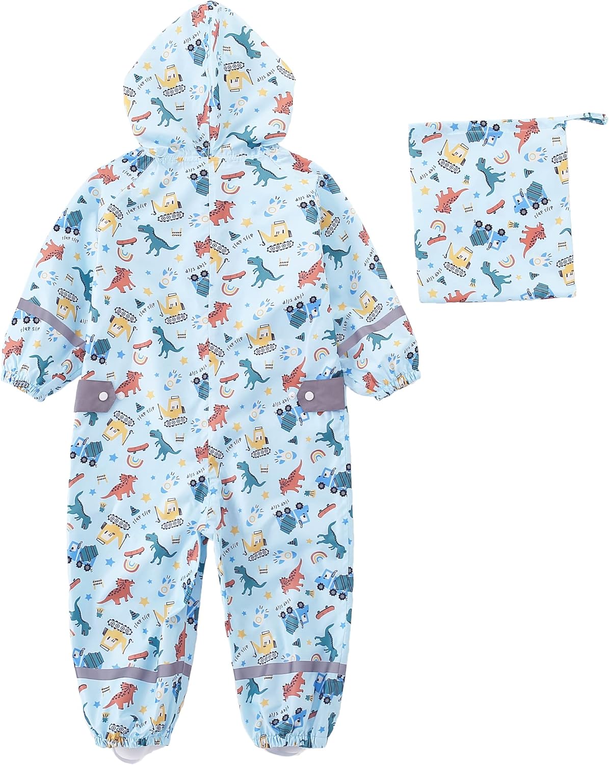 Kids Toddler Rain Suit for Boys Girls One Piece Hoodie Zipper Cartoon Waterproof Coverall Rain Jacket 1-10 Years