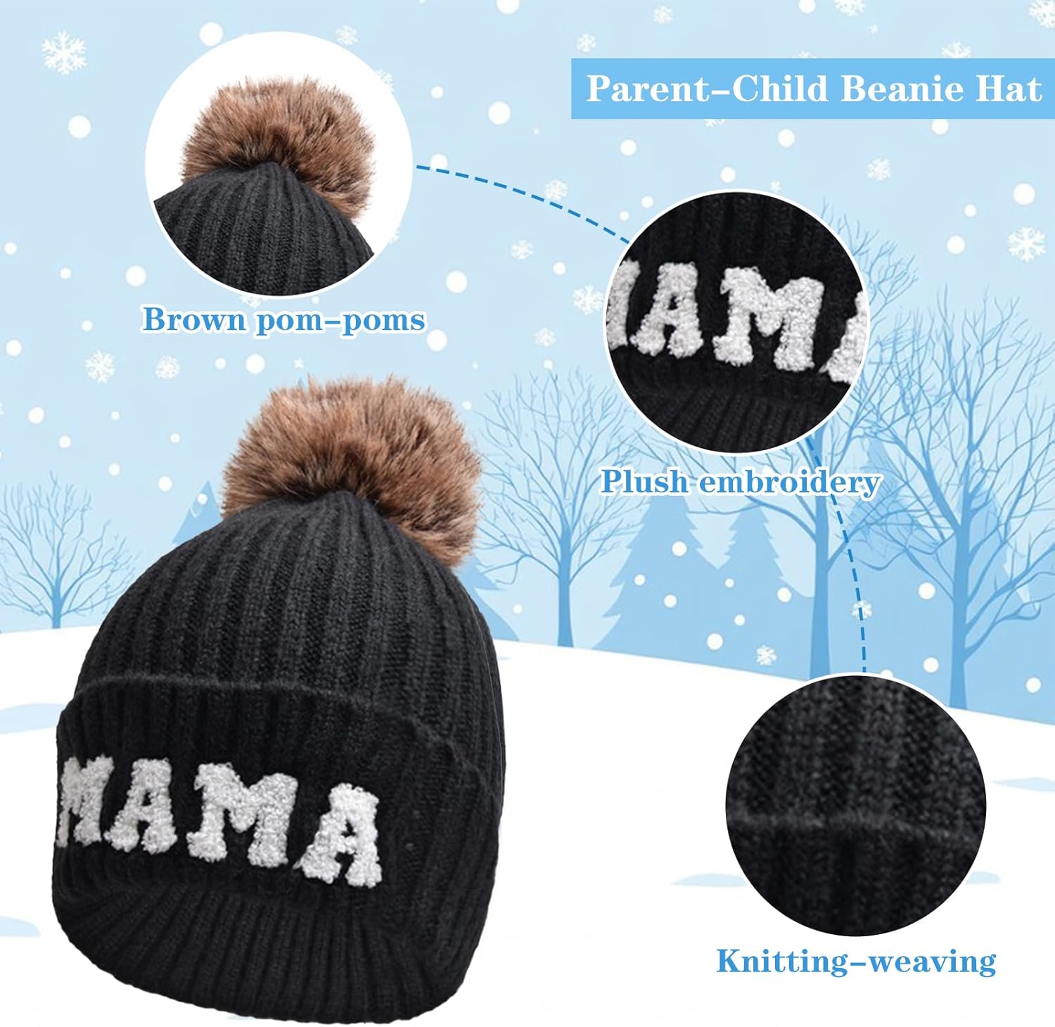 Kunyeah 2PCS Parent-Child Beanie Hat Women Embroidery Knitted Hat Mama and Baby Matching Hats Winter Warm Cap with Pom-Pom