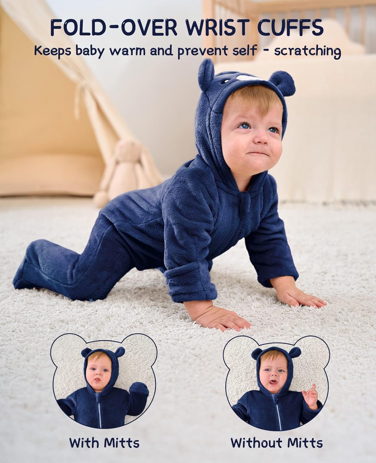 snuggle your infant in our cute bear fleece jumpsuit crafted from ultra-soft, flannel fleece with a 100% cotton-lined hood for cozy heat. The complete-length two-way zipper permits easy diaper adjustments, whereas fold-over mittens, footies design, and a windproof hood hold tiny fingers and toes toasty throughout chilly adventures. Designed with playful bear ears and 4 growth-friendly sizes** (0-3M 3-6M 6-9M 9-12M), this child snowsuit transitions seamlessly from stroller rides to vacation photographs. Machine-washable and fade-resistant, it’s the fuss-free winter important for busy mother and father.