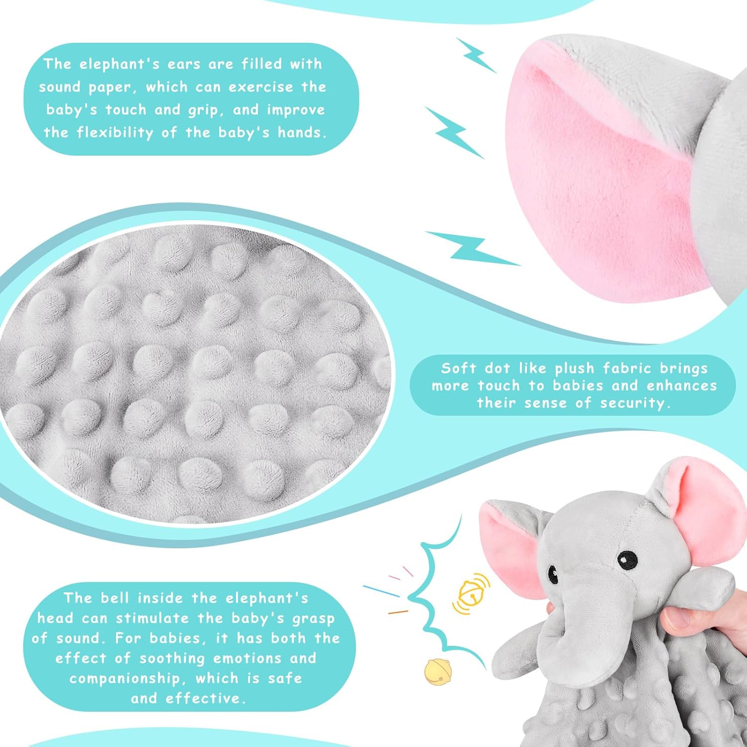 【Multipurpose of Child Lovey Safety Blanket】The elephant’s ears are full of sound paper, which may train the child’s contact and grip energy, arouse the child’s curiosity, and enhance the child’s hand flexibility; The bell contained in the elephant’s head can stimulate the child’s grasp of sound, giving them an preliminary understanding of sound; For infants, it has each a soothing impact and a companionship impact, which is secure and efficient.