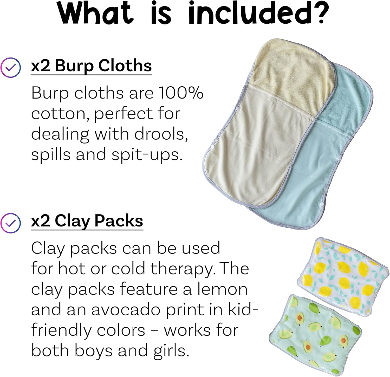 MULTIPURPOSE TREATMENT KIT – Every colic and fever package contains 2 x snuggly and absorbent 100% cotton burp cloths, excellent for coping with drools, spills and spit-ups, plus 2 x sizzling/chilly remedy clay pack inserts, which might be cooled down within the freezer or heated up within the microwave.