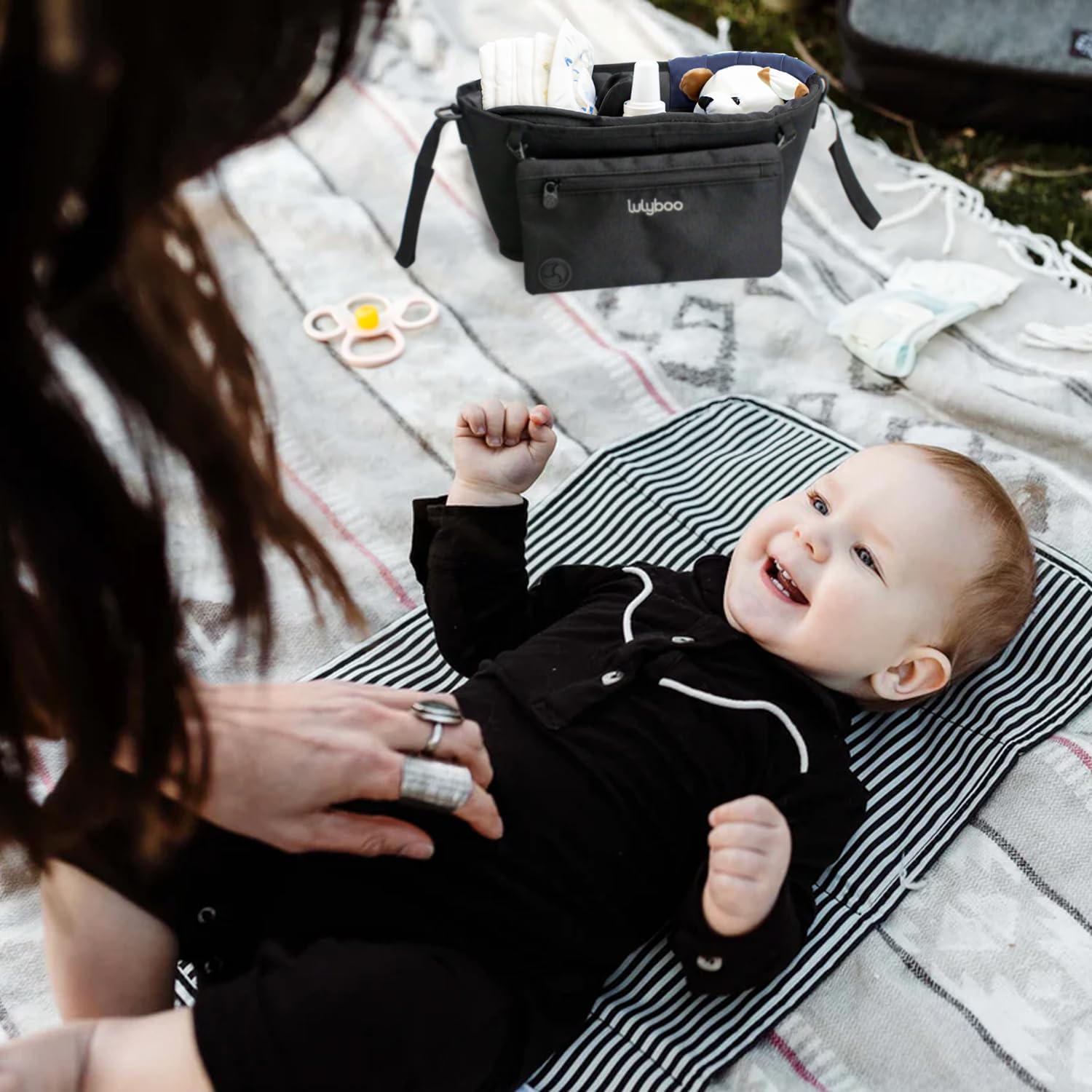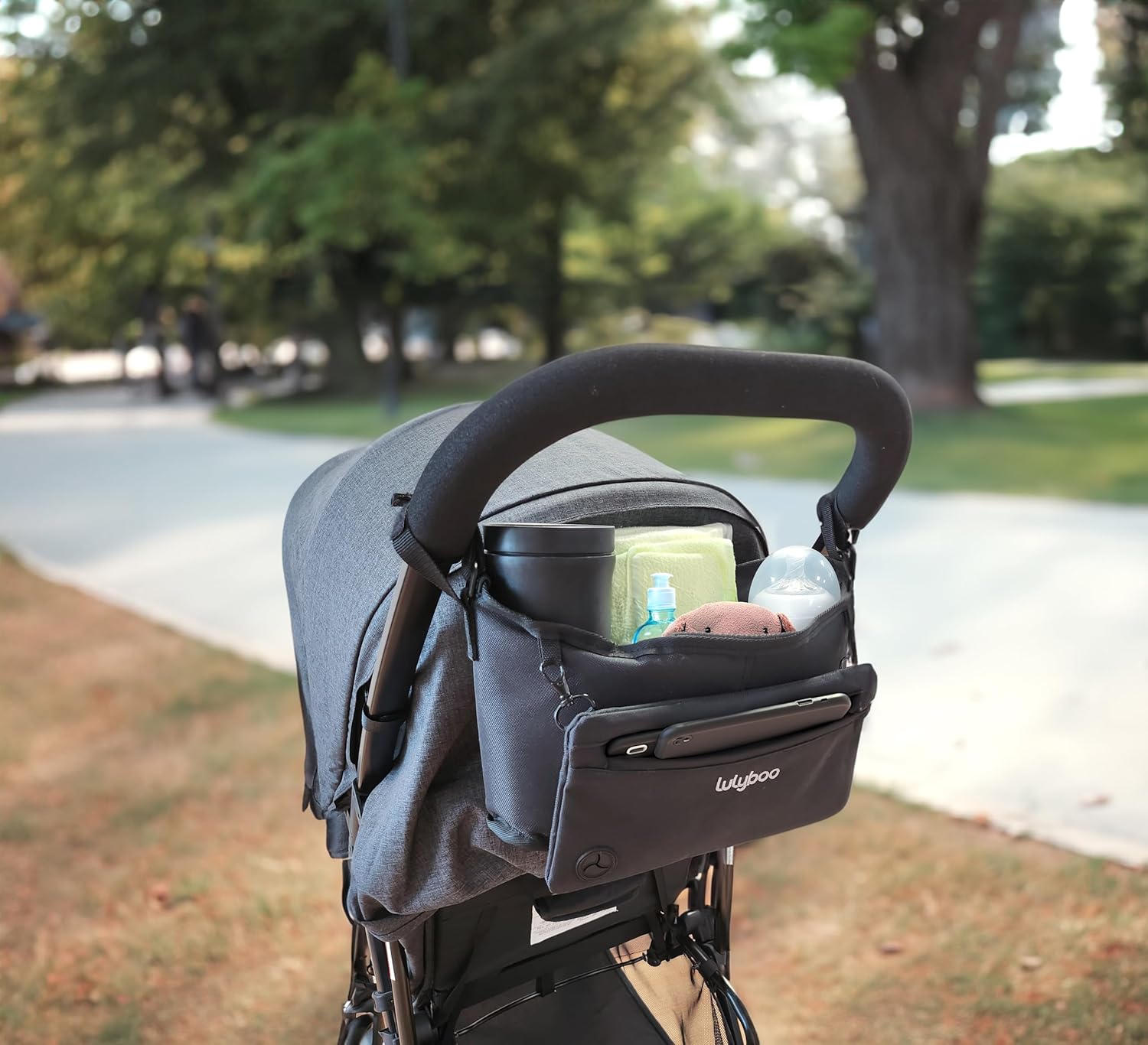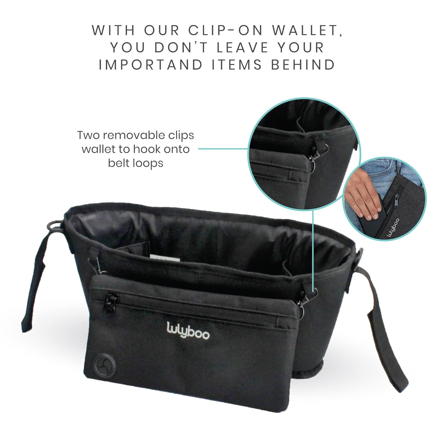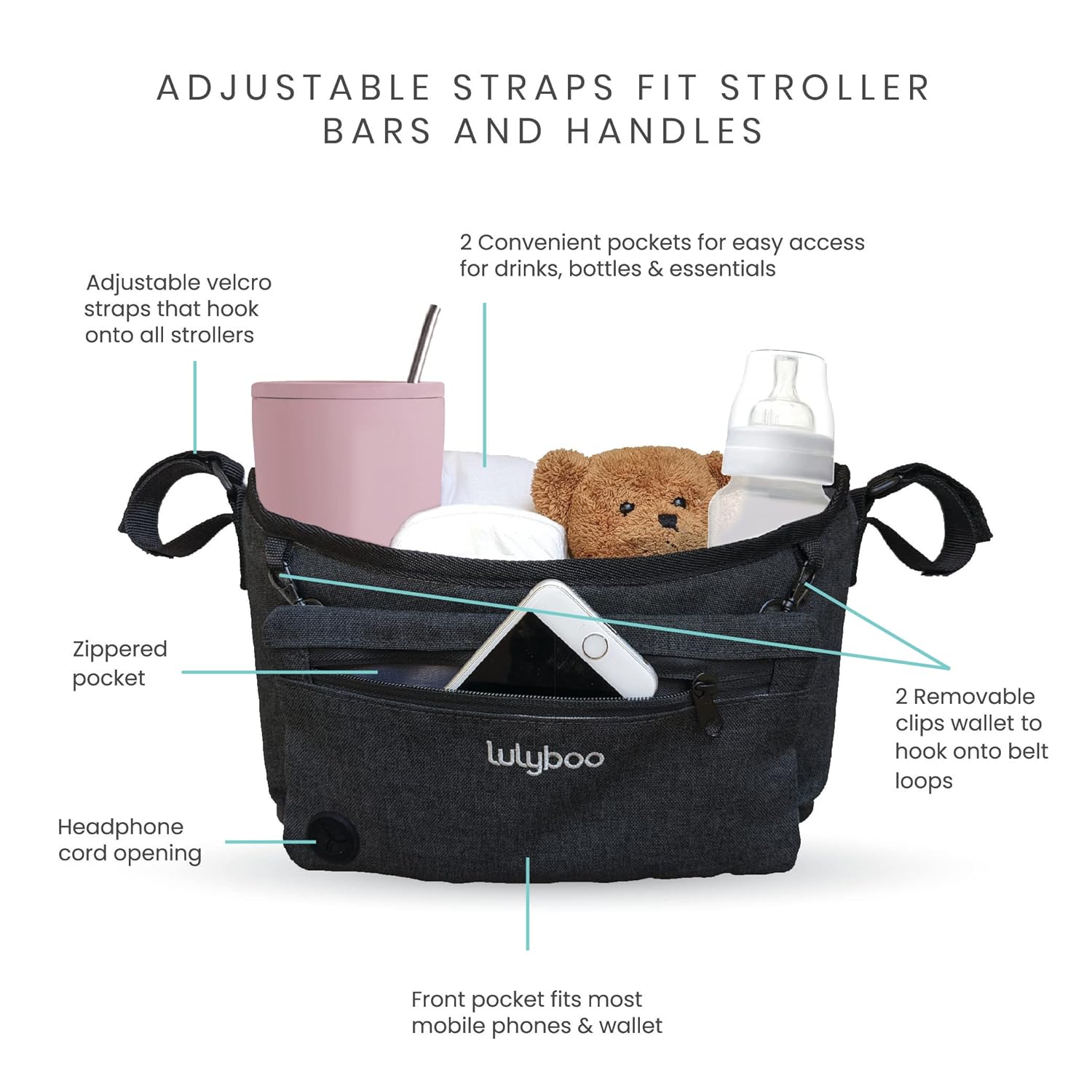 Lulyboo Common Child Stroller Organizer with Clip On Detachable Pockets, Pockets for Drinks, Toys, Keys Grey/Black