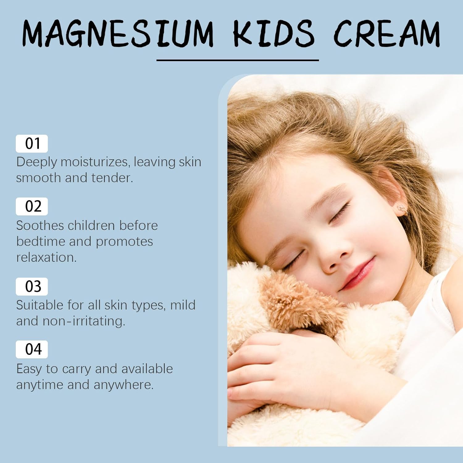 Simple to soak up: Apply a small quantity of kids’s magnesium lotion on clear and dry pores and skin, gently therapeutic massage till it’s fully absorbed. After having a shower or earlier than going to mattress. Our magnesium sleep cream helps create a peaceable evening on your little one.