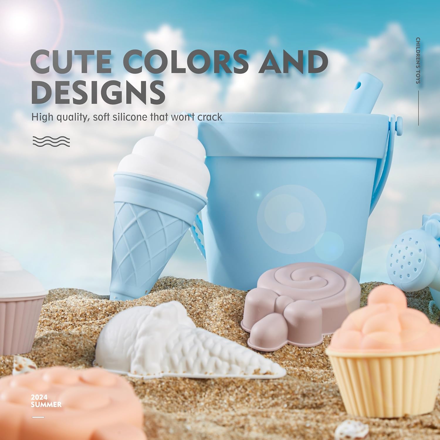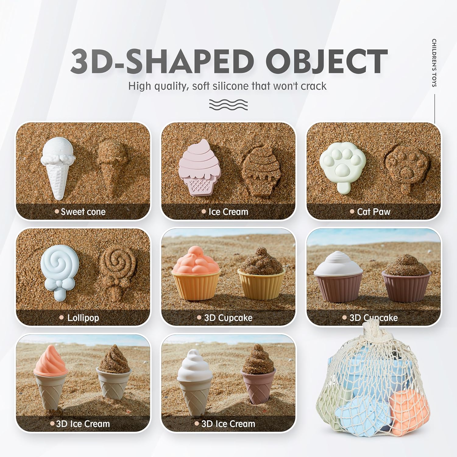 Bundle embrace: Every set incorporates one of many following: one Bucket, one Watering Can, one Shovel, one Spoon, 4 Sand Molds, two 3D Ice cream, two 3D Cupcake, one Seaside Bag