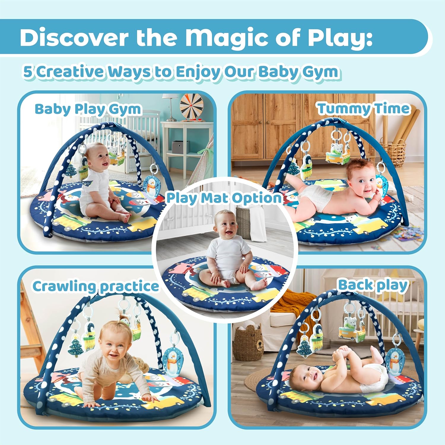 ❄️【6-in-1 Child Exercise Play Mat 】 Measuring 34L x34W x 21.6H (inches), Our Snowy-themed child play mat present supreme help and contains a wide range of participating toys designed to pique your child’s curiosity from each angle, whether or not they’re mendacity down or sitting up. It options 6 removable hanging toys (3 sensory animal rattle toys, 1 self-discovery mirror, 1 crinkle paper, and 1 squeaker plush), together with a tummy time thick and enormous delicate playmat. This setup is designed to completely cater to your