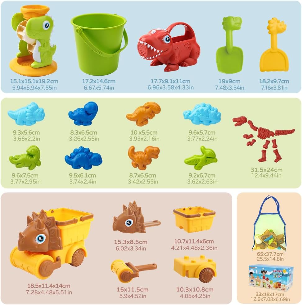 Seaside Sand Toys with Quite a few Equipment- Our dinosaur sand toys set consists of 1pcs dinosaur water wheel,1pcs 4-in-1 dinosaur take aside automotive(1 Truck=4 toys:curler,sand shovel,sandbox,automobile),1pcs seaside bucket with sand sifter,2pcs shovel,8pcs dinosaur sand mildew,10pcs dino skeleton sand mildew,1pcs kettle,1pcs mesh bag.