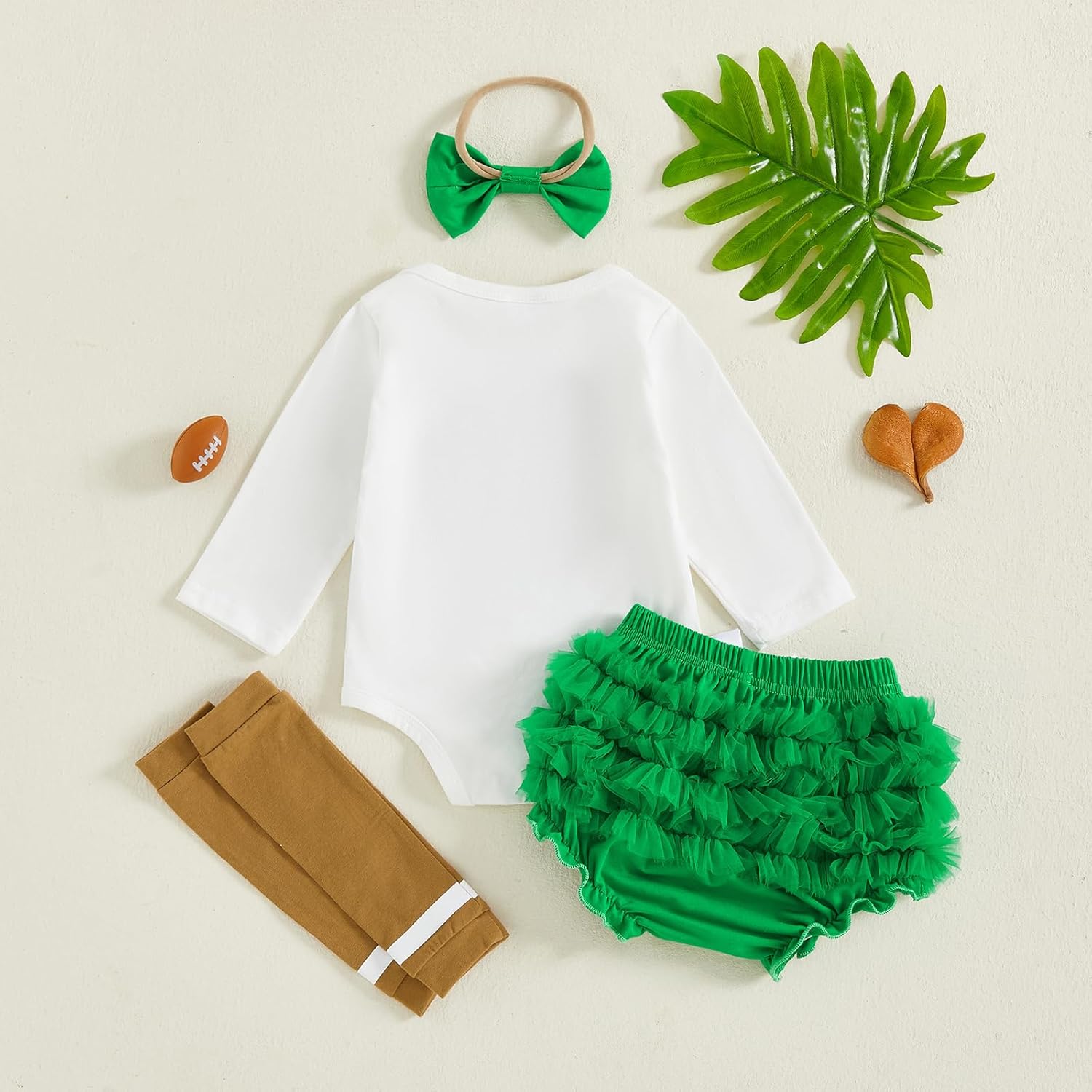 Child Woman Fall Outfits Rugby Letter Print Lengthy Sleeve Romper Layered Mesh Ruffled Skort Bow Headband and Leg Heaters 4 Pcs Set