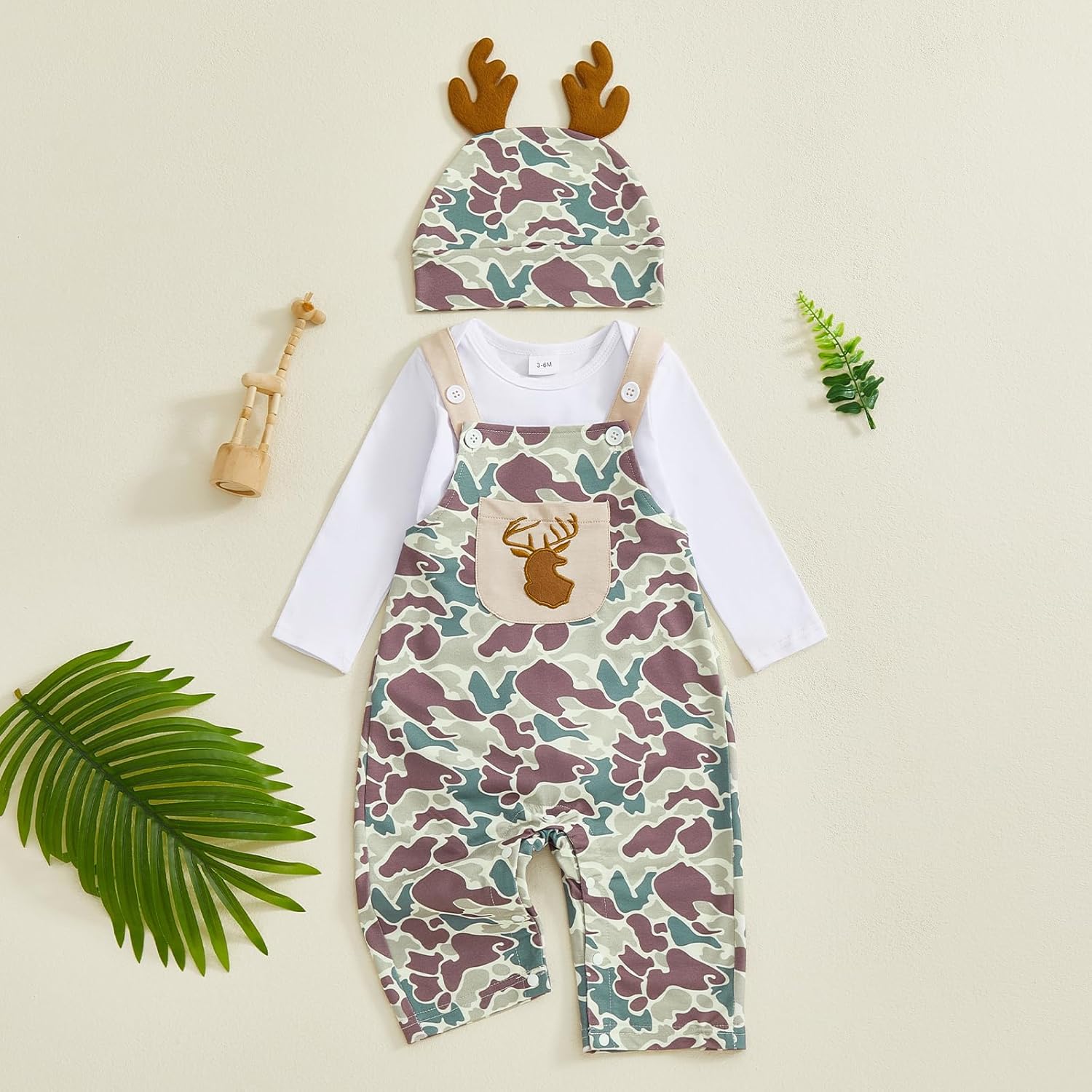 Newborn Baby Boy Hunting Clothes Romper Camo Overalls Pants Set Hat 3Pcs Infant Fall Winter Outfits