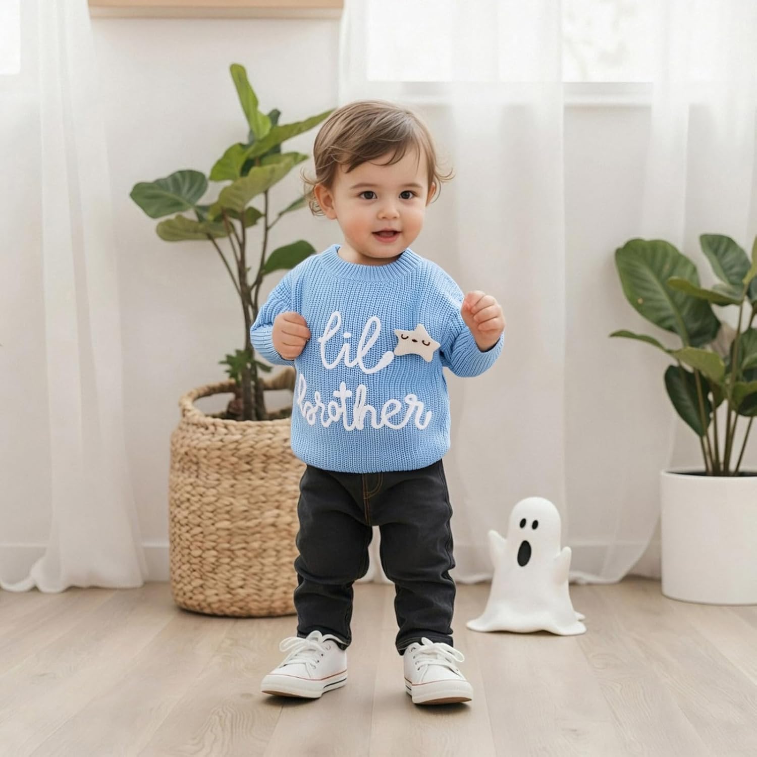 New child Child Boy Knit Sweater Outfit Little Lil Brother Lengthy Sleeve Letter Embroidery Prime Sweatshirt Toddler Fall Garments