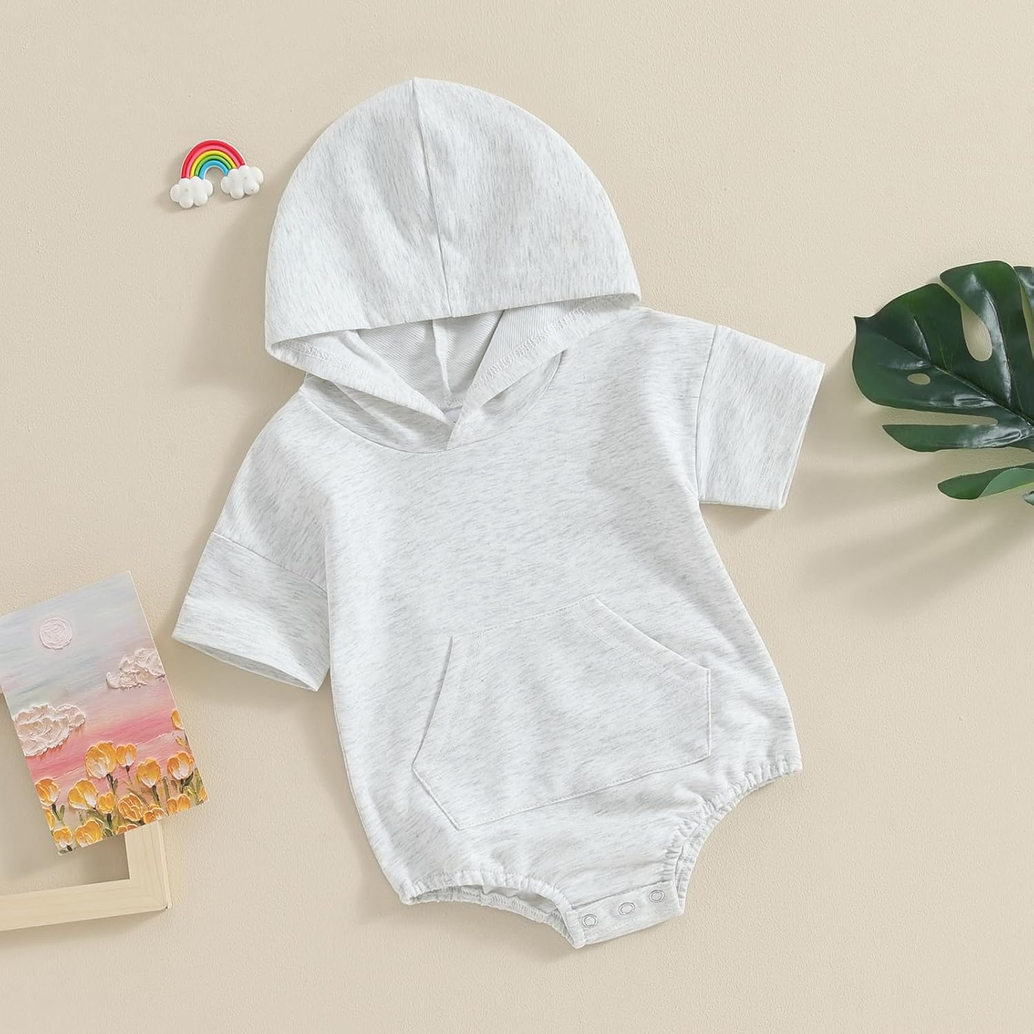 Child Boys Summer season Hooded Jumpsuit Informal Stable Coloration Quick Sleeve Sweatshirt Romper for New child Toddler Cute Garments